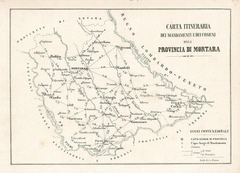 Carta geografica, antica ed originale, della provincia di Mortara. Allegato: una tavola poliometrica dei mandamenti e diverse tavole di itinerari con specifica delle distanze, delle tappe, ecc. Autore: Sebastiano Franco. Luogo: Mortara. Anno: 1857. Tecnica: litografia. Dimensioni: 192x274 mm