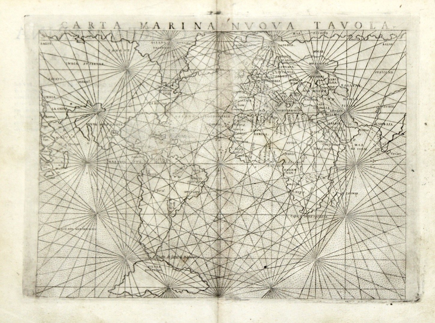 Copper engraving, mm 175x240. Ruscelli's mariner's map is a slightly enlarged version of the map which appeared in Gastaldi's edition of Ptolemy thirteen years earlier. It features a stipple engraved sea and numerous rhumb lines radiating from seventeen focal points. The only change seems to be the omissions of the names Tierra Del Laborador and Tierra Del Bacalaos from the mass of land joining North America to North Europe. The map contains only minimal interior detail but includes several important ports and trading posts including, Zanzibar on the east coast of Africa and Cambay, one of India’s two main ocean ports, visited by Marco Polo in 1293. The Magellan Strait, at the southern tip of South America is labelled and Tierra del Fuego is shown as a very large island. The map appeared in 1562, 1564, 1574 and in Giuseppe Rosaccio's expended edition of Girolamo Russelli Geografia in 1598 and 1599. Girolamo Ruscelli's edition of Ptolemy's Geographia included newly engraved copperplates by Giulio and Livio Sanuto. A fairly good impression, good condition, very light paper discoloration at centerfold. Shirley, World, 111; Burden p. 34, Schilder p.123