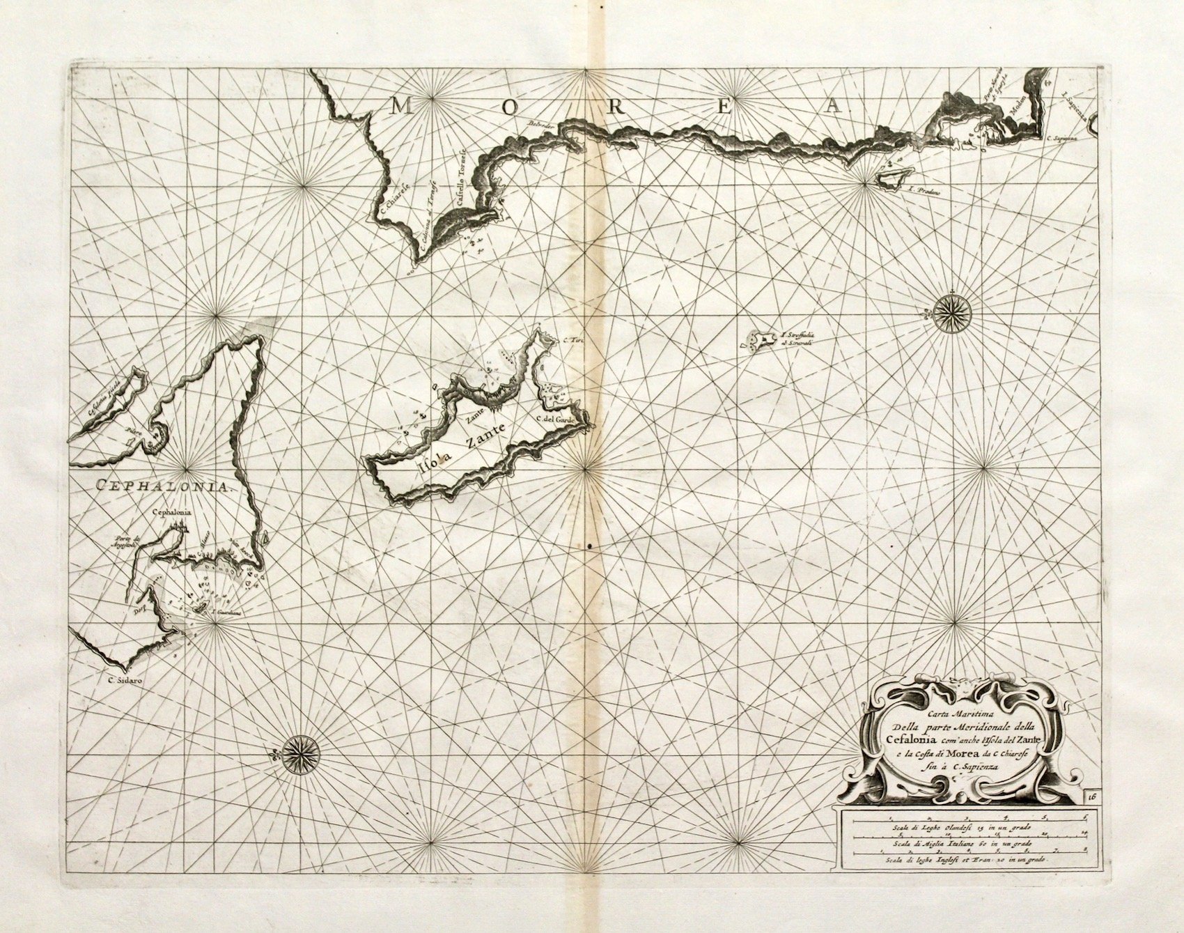Incisione in rame, mm 395x510; non comune carta nautica di parte delle isole Ionie e costa della Morea; tratta da "Prima parte dello specchio del mare" opera pubblicata a Genova nel 1664 e poi ristampata da Coronelli con piccole variazioni nel testo e correzioni alle carte. Non si tratta quindi di un'opera originale, come affermato dallo stesso Coronelli nel frontespizio dell'opera: "Arricchito da carte marine costrutte dal famoso capitano Francesco Maria Levanto e nuovamente pubblicato…senza alcuna, benchè minima alterazione: Ricorretto bensì coll'originale…"<BR>Coronelli, vulcanico religioso veneziano, fu autore fra la fine del secolo e gli inizi del successivo di decine di importanti pubblicazioni fra cui ricordiamo il "Libro dei globi", oltre ai celebri globi costruiti per il re di Francia, "Atlante Veneto" e "Teatro della guerra"<BR>Bell'esemplare. Lieve ossidazione alla piega centrale, alcuni fori di tarlo al marg. sup. e inf. alla piega centrale. Armao, pag. 132