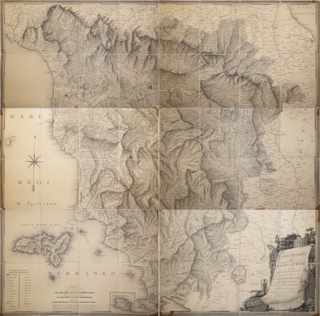 Rara carta geografica disegnata da Gaudenzio Bordiga ed incisa da Leone Antonini per il Deposito Generale della Guerra, diretto da Antonio Campana. “Il Regno d'Etruria venne costituito il 21 marzo 1801 a seguito del trattato di Aranjuez e fu designato come sovrano Ludovico I di Borbone, che aveva rinunciato ai ducati di Parma e Piacenza, annessi alla Francia. Il regno ebbe vita brevissima poi- ché il 10 dicembre 1807 venne definitivamente annesso all'Impero Francese. In questo breve arco temporale ebbe vita un "Bureau Géographique" (Scrittojo Geografico in alcuni documenti) diretto da Giovanni de Baillou (1758-1819) che ebbe, nel 1801, la nomina di "Geografo regio". Nel tentativo di fornire una base geometrica al catasto approvato da Ludovico di Borbone 1'11 agosto 1802, de Baillou effettuò con il Barone de Zach alcune osservazioni astronomiche, trigonometriche e livellazioni sul territorio toscano. La carta manoscritta fu terminata nel 1804, in scala 1:500 000, con dedica alla Regina Maria Luisa di Borbone (Toscana dei Lorena 1991: 120), e si sa che una copia di questa carta "che fu tenuta per la migliore fra le conosciute in quel tempo, venne acquistata a non lieve prezzo per l'Uffizio geografico dell'Italiana Repubblica" (Pera 1867: 319). Tuttavia, è poco probabile, come asserisce Mori e molti altri recenti studiosi, che la "Carta militare del Regno d'Etruria" sia stata realizzata nel Deposito generale della Guerra di Milano sulla scorta della carta di Baillou, per altro non menzionato nella breve nota storica presente sul quinto foglio. Nel breve testo esplicativo si fa riferimento solo alle "più recenti Astronomiche osservazioni", probabilmente quelle eseguite dai Francesi diretti dal geodeta Louis Puissant (1769- 1843) nell'isola d'Elba, negli anni 1802-3 (Bertahut 1904: I, 402-410) per connetterla alla Corsica e alla Francia. Inoltre, "à part quelques points de la côté determinés par Tofino et par Puissant osserva Berthaut - la carte [di Baillou] ne possedait d'autre charpente que les positions astronomique de Pise, Livourne et Florance" (Berthut; II, 380). La scala della carta milanese è più che doppia di quella utilizzata da Baillou (le carte derivate sono in genere più piccole degli originali), il contorno costiero è significativamente differente, i rilievi han- no conformazione e andamento diversi e le longitudini sono riferite a Parigi e non all'isola di Ferro. D'altro canto, l'esistenza di una prima tiratura della carta milanese datata 1804 (Peco 1998: 186), nel cui titolo non vi è menzione del Principato di Lucca, porta a escludere che si sia potuto fare uso della carta di Baillou terminata quello stesso anno. I dettagli della carta, come è riportato nel testo esplicativo al di sotto delle scale, sono stati desunti "dalle scelte Carte Topografiche del Sig.r Generale Divisione D?browski, non che dalle ricognizioni militari eseguite nelle prossime passate guerre". Il generale polacco Jan Henryk D?browski (1755-1818) era al servizio della Armé d'Italie quando, al comando di una legione polacca, fu inviato a reprimere la rivolta di Arezzo insorta il 6 maggio 1799 contro il governo di occupazione francese (Battaglia di Rigutino), da cui il possibile riferimento alle "ricognizioni militari" eseguite pochi anni prima. La carta disegnata da Gaudenzio Bordiga, e incisa da Leone Antonini (1776-1862), è in sostanza un prodotto assolutamente nuovo e originale sebbene realizzato sulla scorta di materiale eterogeneo. La carta della Toscana, alla quale Baillou continuò a lavorare negli anni successivi, in qualità di direttore dello “Scrittojo geografico” toscano, non vide mai luce” (cfr. V. Valerio in La cartografia italiana in ètà Napoleonica (1796-1815) pp. 166-167, n. 71). Gaudenzio Bordiga (1773-1837), disegnatore e incisore attivo a Milano nella prima metà del XIX secolo, dove tra l'altro rivesti l'incarico di Capo incisore nel Deposito della Guerra. Il Deposito della Guerra di Milano e. Rara carta geografica disegnata da Gaudenzio Bordiga ed incisa da Leone Antonini per il Deposito Generale della Guerra, diretto da Antonio Campana. “Il Regno d'Etruria venne costituito il 21 marzo 1801 a seguito del trattato di Aranjuez e fu designato come sovrano Ludovico I di Borbone, che aveva rinunciato ai ducati di Parma e Piacenza, annessi alla Francia. Il regno ebbe vita brevissima poi- ché il 10 dicembre 1807 venne definitivamente annesso all'Impero Francese. In questo breve arco temporale ebbe vita un "Bureau Géographique" (Scrittojo Geografico in alcuni documenti) diretto da Giovanni de Baillou (1758-1819) che ebbe, nel 1801, la nomina di "Geografo regio". Nel tentativo di fornire una base geometrica al catasto approvato da Ludovico di Borbone 1'11 agosto 1802, de Baillou effettuò con il Barone de Zach alcune osservazioni astronomiche, trigonometriche e livellazioni sul territorio toscano. La carta manoscritta fu terminata nel 1804, in scala 1:500 000, con dedica alla Regina Maria Luisa di Borbone (Toscana dei Lorena 1991: 120), e si sa che una copia di questa carta "che fu tenuta per la migliore fra le conosciute in quel tempo, venne acquistata a non lieve prezzo per l'Uffizio geografico dell'Italiana Repubblica" (Pera 1867: 319). Tuttavia, è poco probabile, come asserisce Mori e molti altri recenti studiosi, che la "Carta militare del Regno d'Etruria" sia stata realizzata nel Deposito generale della Guerra di Milano sulla scorta della carta di Baillou, per altro non menzionato nella breve nota storica presente sul quinto foglio. Nel breve testo esplicativo si fa riferimento solo alle "più recenti Astronomiche osservazioni", probabilmente quelle eseguite dai Francesi diretti dal geodeta Louis Puissant (1769- 1843) nell'isola d'Elba, negli anni 1802-3 (Bertahut 1904: I, 402-410) per connetterla alla Corsica e alla Francia. Inoltre, "à part quelques points de la côté determinés par Tofino et par Puissant osserva Berthaut - la carte [di Baillou] ne pos