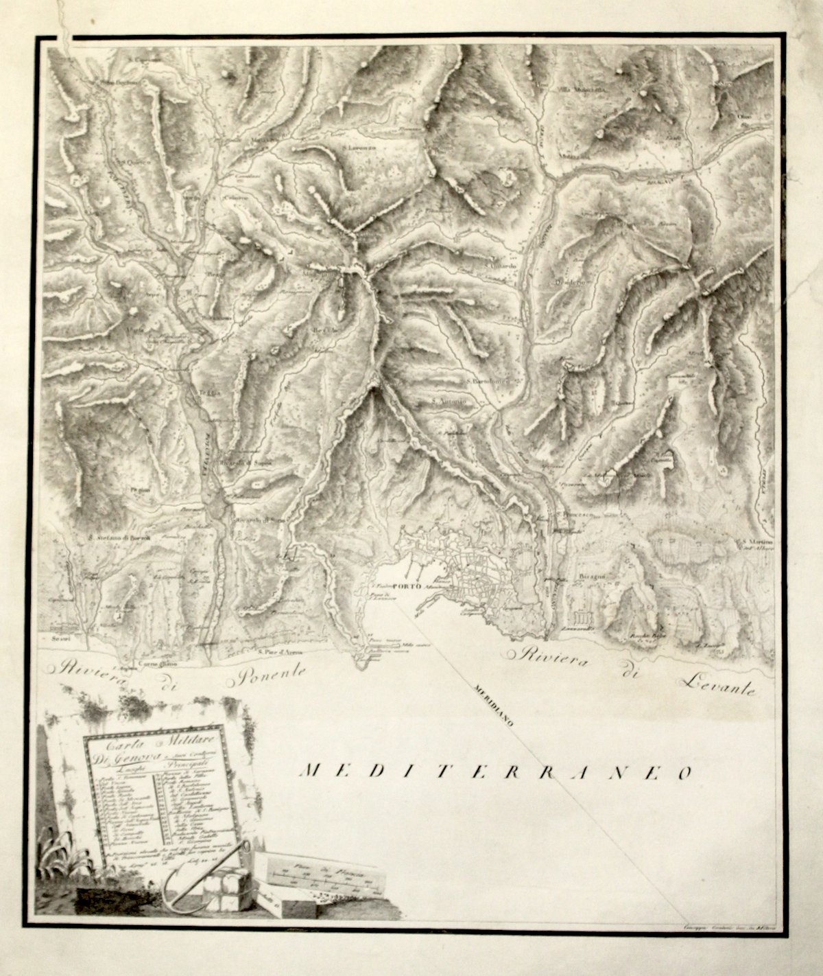 Incisione in rame 440x525. Carta topografica assai dettagliata di Genova e dintorni. Buon esemplare con angolo superiore destro e margine destro parzialmente rifatti, alcuni strappi restaurati di cui uno fino al limite della parte incisa. Lieve alone orizzontale fra la costa e l'indicazione " mediterraneo ".