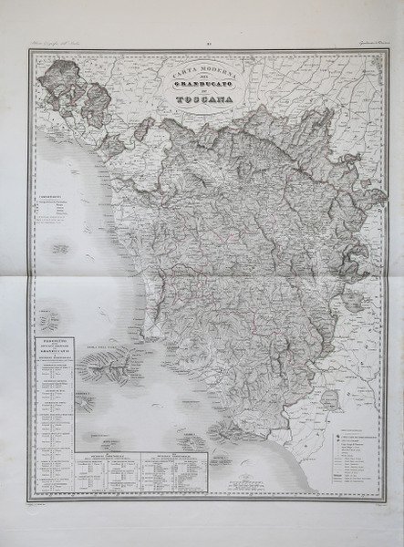 Carta geografica tratta dall’Atlante geografico degli Stati italiani delineato sopra le migliori e più moderne mappe per servire di corredo alla corografia fisica storica e statistica dell'Italia, di Attilio Zuccagni Orlandini ' stampato a Firenze, presso gli editori, 1844. In 2° massimo, 2 voll. Il primo volume contenente le carte dell’Italia Superiore in 52 fogli, il secondo volume quelle dell’Italia Inferiore in 77 fogli. Attilio Zuccagni Orlandini (1784-1872) nacque a Fiesole con il nome di Giuseppe Orlandini. In seguito all’adozione da parte del facoltoso zio materno Attilio Zuccagni (1754-1807), botanico e georgofilo, assunse il nome di Attilio Zuccagni Orlandini. La sua più importante opera è la relazione geografico-cartografica di tutti gli Stati preunitari italiani, la grandiosa ' Corografia fisica, storica e statistica dell’Italia e delle sue Isole ' (Firenze 1835-1845), in dodici volumi per diciannove tomi, con un volume introduttivo sull’intera penisola italiana. L’opera costituì la summa delle centinaia di opere geografiche generali, regionali e locali allora disponibili e presentava, per ogni Stato preunitario, la trattazione fisica, storica, topografica e un inquadramento statistico. Nel 1844-45, la ' Corografia ' fu arricchita con cinque volumi di cartografie, vedute e altre illustrazioni di luoghi e monumenti: ' Atlante geografico degli Stati italiani delineato sopra le migliori e più moderne mappe ' (due volumi con 144 tavole inclusa la grande carta della penisola in 15 fogli) e ' Atlante illustrativo ossia raccolta dei principali monumenti italiani antichi, del medio evo e moderni e di alcune vedute pittoriche ' (tre volumi con 413 illustrazioni, stampate su 269 fogli). Le tavole furono incise, sempre a Firenze, in due apposite officine, da quattro valenti artisti lombardi (Vittorio Angeli, Giacinto Maina, Pietro Manzoni e Giuseppe Pozzi). Soprattutto il primo dei due atlanti rappresenta, ancora oggi, una pietra miliare nella storia della cartografia e dell’iconografia geografica italiana. Fu veramente ‘un’ardua impresa’, dal momento che spesso mancavano ancora (come, ad esempio, per il ' Ducato di Lucca ' e lo ' Stato Pontificio) prodotti cartografici compiutamente geometrici. I due prodotti furono presentati ai Georgofili nel 1843 e nel 1844, insieme alla mappa della Repubblica di San Marino. L’opera si rivelò oltremodo costosa e non ottenne il successo commerciale sperato, ma servì da base per tante altre iniziative editoriali successive che vi attinsero, talora senza neppure rispettarne i diritti d’autore. Incisione in rame, coloritura coeva dei contorni, lievi ossidazioni, per il resto in ottimo stato di conservazione. ' Bibliografia Cfr. Anna Guarducci - ' Dizionario Biografico degli Italiani ' - Volume 100 (2020). Map taken from the ' Atlante geografico degli Stati italiani delineato sopra le migliori e più moderne mappe per servire di corredo alla corografia fisica storica e statistica dell'Italia, di Attilio Zuccagni Orlandini ' printed in Florence, 1844. The first volume contains the maps of Northern Italy in 52 sheets, the second volume those of Southern Italy in 77 sheets. Attilio Zuccagni Orlandini (1784-1872) was born in Fiesole under the name of Giuseppe Orlandini. Following adoption by his wealthy maternal uncle Attilio Zuccagni (1754-1807), a botanist and georgofile, he took the name Attilio Zuccagni Orlandini. ' His most important work is the geographic-cartographic report of all the pre-unification Italian states, the great ' Corografia fisica, storica e statistica dell'Italia e delle sue Isole ' (Florence 1835-1845), in twelve volumes for nineteen tomes, with an introductory volume on the entire Italian peninsula. The work constituted the sum of hundreds of general, regional and local geographic works then available and presented, for each pre-unification state, the physical, historical, topographical and statistical framework. In 1844-45, the Corografia was enriched with five volumes of maps, views and other illustrations of places and monuments: ' Atlante geografico degli Stati italiani delineato sopra le migliori e più moderne mappe ' (two volumes with 144 plates including the large map of the peninsula in 15 sheets) and ' Atlante illustrativo ossia raccolta dei principali monumenti italiani antichi, del medio evo e moderni e di alcune vedute pittoriche ' (three volumes with 413 illustrations, printed on 269 sheets). The plates were engraved, again in Florence, in two special workshops, by four talented Lombard artists (Vittorio Angeli, Giacinto Maina, Pietro Manzoni and Giuseppe Pozzi). ' Especially the first of the two atlases represents, even today, a milestone in the history of cartography and Italian geographic iconography. It was truly 'an arduous undertaking', since cartographic products were often still lacking (as, for example, for the Duchy of Lucca and the Papal States) fully geometric. The two products were presented to the Georgofili in 1843 and 1844, along with the map of the Republic of San Marino. The work proved to be very expensive and did not achieve the commercial success hoped for, but served as a basis for many other subsequent publishing initiatives that drew on it, sometimes without even respecting the copyright. Copperplate with fine outline colour, good condition. ' Literature Anna Guarducci - ' Dizionario Biografico degli Italiani ' - Volume 100 (2020). Cfr.