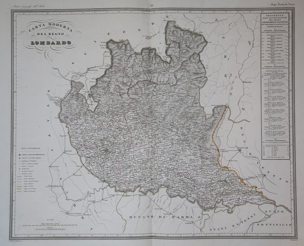 Carta geografica tratta dallâAtlante geografico degli Stati italiani delineato sopra le migliori e più moderne mappe per servire di corredo alla corografia fisica storica e statistica dell'Italia, di Attilio Zuccagni Orlandini stampato a Firenze, presso gli editori, 1844. In 2° massimo, 2 voll. Il primo volume contenente le carte dellâItalia Superiore in 52 fogli, il secondo volume quelle dellâItalia Inferiore in 77 fogli. Attilio Zuccagni Orlandini (1784-1872) nacque a Fiesole con il nome di Giuseppe Orlandini. In seguito allâadozione da parte del facoltoso zio materno Attilio Zuccagni (1754-1807), botanico e georgofilo, assunse il nome di Attilio Zuccagni Orlandini. La sua più importante opera è la relazione geografico-cartografica di tutti gli Stati preunitari italiani, la grandiosa Corografia fisica, storica e statistica dellâItalia e delle sue Isole (Firenze 1835-1845), in dodici volumi per diciannove tomi, con un volume introduttivo sullâintera penisola italiana. Lâopera costituì la summa delle centinaia di opere geografiche generali, regionali e locali allora disponibili e presentava, per ogni Stato preunitario, la trattazione fisica, storica, topografica e un inquadramento statistico. Nel 1844-45, la Corografia fu arricchita con cinque volumi di cartografie, vedute e altre illustrazioni di luoghi e monumenti: Atlante geografico degli Stati italiani delineato sopra le migliori e più moderne mappe (due volumi con 144 tavole inclusa la grande carta della penisola in 15 fogli) e Atlante illustrativo ossia raccolta dei principali monumenti italiani antichi, del medio evo e moderni e di alcune vedute pittoriche (tre volumi con 413 illustrazioni, stampate su 269 fogli). Le tavole furono incise, sempre a Firenze, in due apposite officine, da quattro valenti artisti lombardi (Vittorio Angeli, Giacinto Maina, Pietro Manzoni e Giuseppe Pozzi). Soprattutto il primo dei due atlanti rappresenta, ancora oggi, una pietra miliare nella storia della cartografia e dellâiconografia geografica italiana. Fu veramente âunâardua impresaâ, dal momento che spesso mancavano ancora (come, ad esempio, per il Ducato di Lucca e lo Stato Pontificio) prodotti cartografici compiutamente geometrici. I due prodotti furono presentati ai Georgofili nel 1843 e nel 1844, insieme alla mappa della Repubblica di San Marino. Lâopera si rivelò oltremodo costosa e non ottenne il successo commerciale sperato, ma servì da base per tante altre iniziative editoriali successive che vi attinsero, talora senza neppure rispettarne i diritti dâautore. Incisione in rame, coloritura coeva dei contorni, lievi ossidazioni, per il resto in ottimo stato di conservazione. Bibliografia Cfr. Anna Guarducci - Dizionario Biografico degli Italiani - Volume 100 (2020).