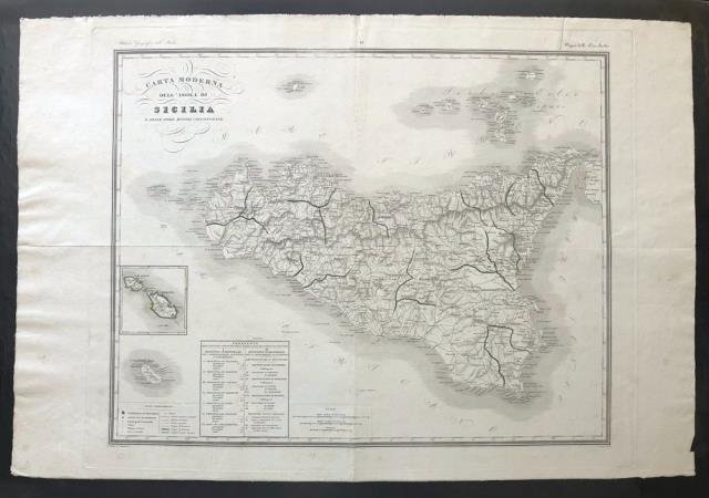 Tratta dall'atlante "Atlante geografico, fisico - storico, corografico dell'Italia", Firenze, 1842 - 1845. Disegnata da G. Pozzi e incisa da V. Maina e da G. Stanghi, incisione in rame ripiegata a doppia pagina, b/n (confini in colore d'epoca), cm 60,5 x 75,5 (alla lastra) più margini bianchi. La carta appartiene al Regno delle due Sicilie. Nella carta sono presenti il gruppo delle Isole Eolie e delle Lipari, Pantelleria, Malta e Gozo (in riquadro); entro riquadro, il prospetto delle “Divisioni Politiche della Sicilia”. Esemplare a pieni margini in assai buono stato di conservazione.