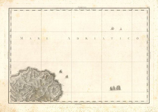 Carta geografica raffigurante il territorio litorale compreso tra Peschici e Vieste; foglio n° 8. Alcuni segni di foxing prevalentemente lungo i bordi. Foglio integro con ampi margini. Autore: Rizzi Zannoni del. & Gius. Guerra inc. Luogo: Puglia - Gargano. Anno: 1806. Tecnica: incisione in rame. Dimensioni: 520x760 mm