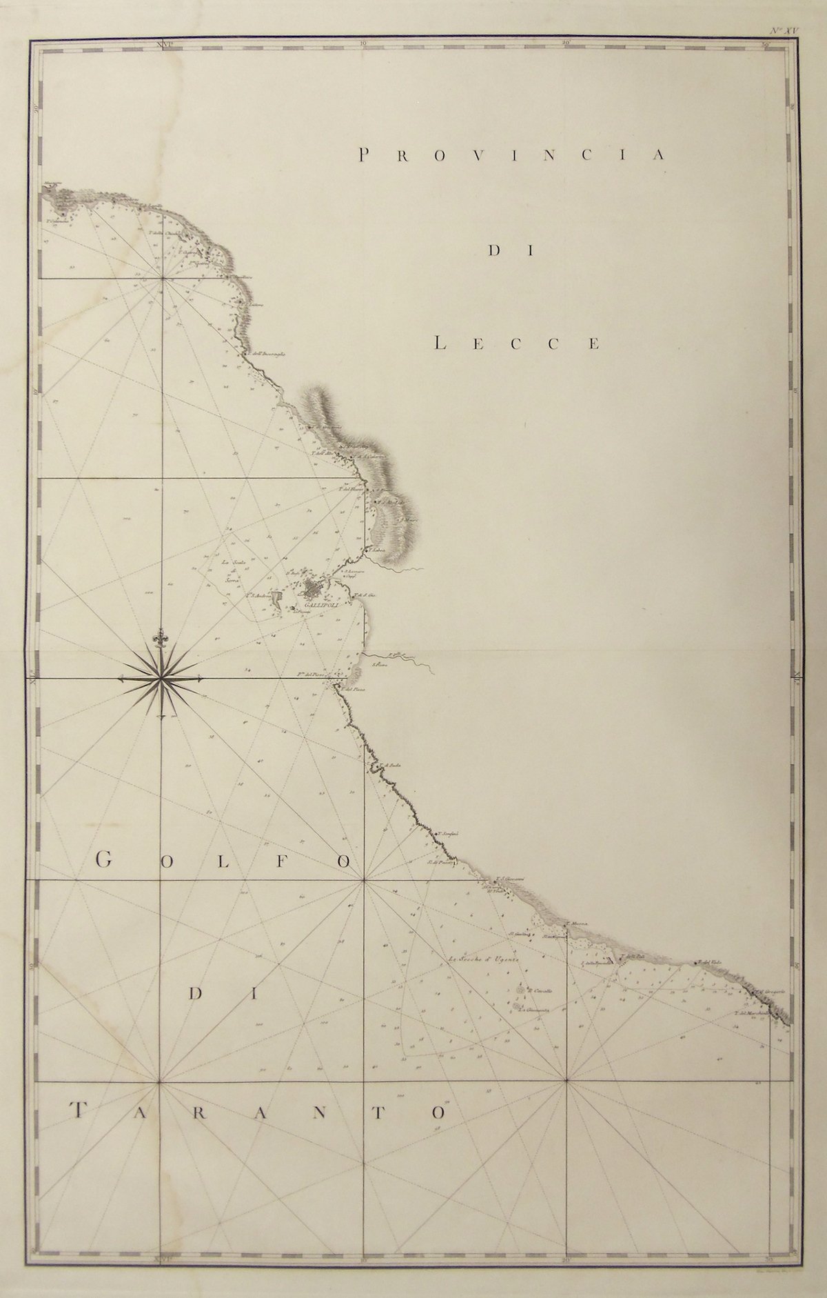 Incisione in rame di Giuseppe Guerra, mm 895x590. Raffigura la costa a nord e sud di Gallipoli compresa tra Torre Columena e Torre San Gregorio. Tratta da "Atlante Marittimo delle Due Sicilie" realizzato tra il 1783 ed il 1792. Ottimo stato di conservazione eccettuata qualche pieghetta.