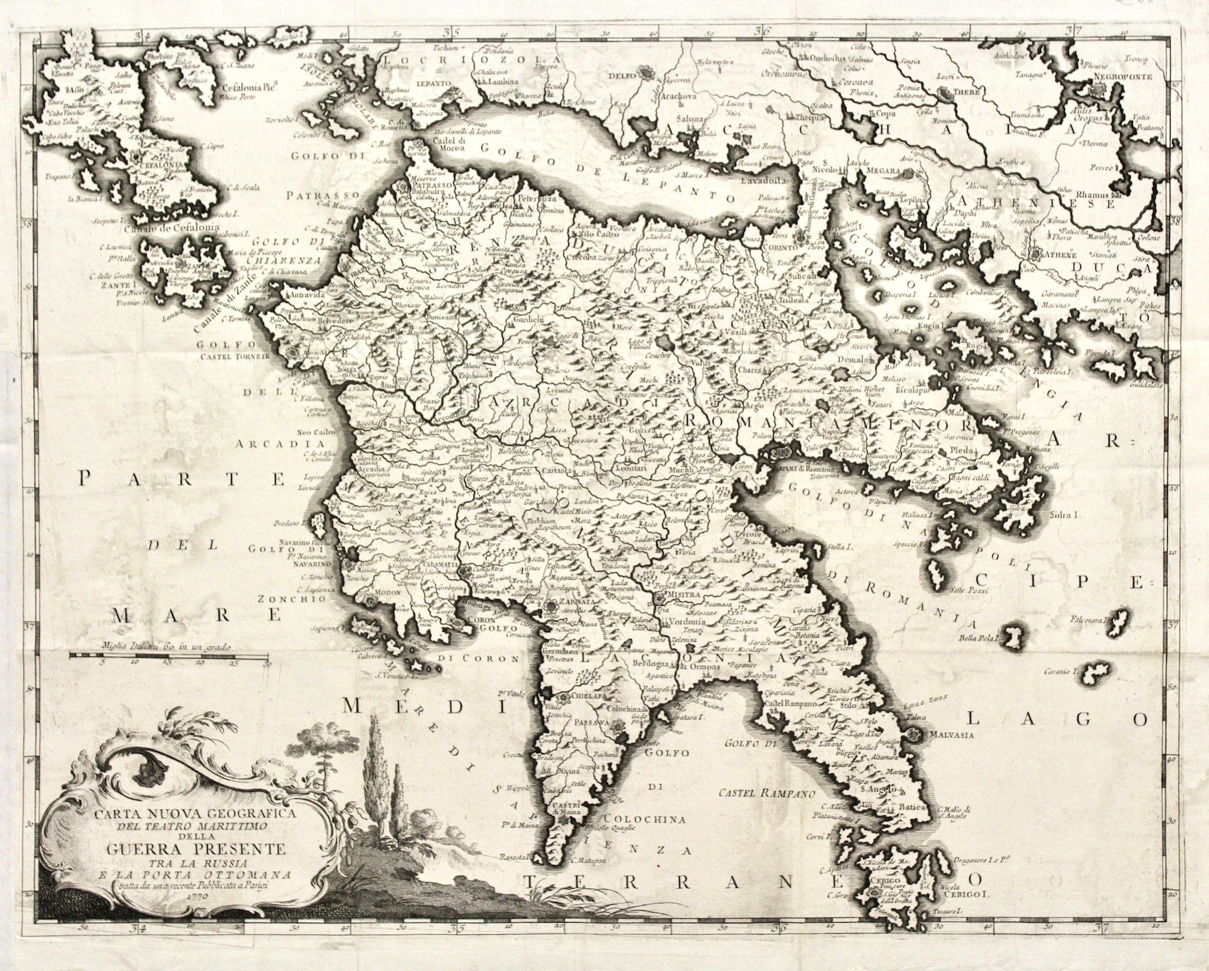 Incisione in rame, mm 427x546, traccia di pieghe editoriali. Rarissima carta del Peloponneso, sconosciuta a Zacharakis, che a pag. 131 riporta una carta tedesca simile, attribuita a S. Dorn e datata 1771-75. Si tratta probabilmente di una copia di misura molto ridotta tratta dalla nostra, probabilmente inserita in un’opera veneziana sulla guerra russo-turca del 1768-1774, che costituì l’inizio dei un tentativo di espansione russa nella penisola balcanica a scapito del regno ottomano. La carta sembra stranamente repertoriata solo nel museo della città polacca di Oppeln, anche se quasi sicuramente, sebbene sia essa molto rara, esisteranno copie del libro, a noi sconosciuto, in biblioteche italiane. Molto ben conservata. Tracce di stampa di inchiostro in controparte. Manca a Zacharakis “A catalogue of printed maps of Greece 1477-1800. Third edition”<BR><BR>