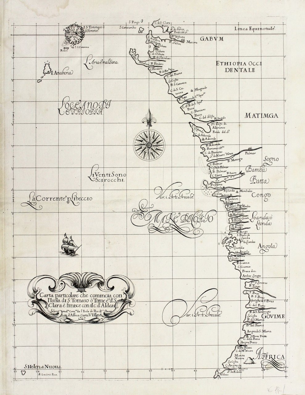 Incisione in rame, mm 485x378. La carta raffigura la costa dall'isola di Saõ Tomé e capo Santa Clara nel Gabon verso sud descrivendo le coste di Congo, Angola e Namibia; tratta da "Dell'Arcano del Mare" di Robert Dudley (1574-1649), che rappresenta il primo atlante marittimo del mondo intero stampato da un inglese e ad usare la proiezione di Mercatore e la declinazione magnetica. Le mappe sono tutte originali, caratterizzate dalla particolare decorazione barocca di Lucini. Dudley lasciò l'Inghilterra nel 1605 e si trasferì al servizio di Cosimo II, Gran Duca di Toscana come ingegnere e comandante navale. Nel 1646, dopo 12 anni di fatica, pubblicò l'atlante. Lucini, l'incisore nacque a Firenze, fu allievo di Callot e amico di Della Bella. A lui si deve la finezza incisoria e la bellezza del testo inciso "alla Cancelleresca". Robert Dudley's "Arcano del mare" is "one of the greatest atlases of the world and one of the most complex ever produced: it is the first sea-atlas of the whole world; the first with all the charts constructed using Mercator's new projection, as corrected by Edward Wright; the first to give magnetic declination; the first to give prevailing winds and currents. the first to expound the advantages of "Great Circle Sailing"; and the first sea-atlas to be compiled by an Englishman." (Lord Wardington). Ottimo esemplare. <BR>Copper engraving, mm 475x750. The map shows south-west Africa coast, the earliest obtainable sea chart of the region. It shows the coastline of Namibia and Angola. Second state (with L°6° added in the cartouche). From "Dell'Arcano del mare", the first english nautical atlas and the first maritime atlas to use the mercator projection first edition. Robert Dudley's "Arcano del mare" is "one of the greatest atlases of the world and one of the most complex ever produced: it is the first sea-atlas of the whole world; the first with all the charts constructed using Mercator's new projection, as corrected by Edward Wright; the first to give magnetic declination; the first to give prevailing winds and currents. the first to expound the advantages of "Great Circle Sailing"; and the first sea-atlas to be compiled by an Englishman." (Lord Wardington). <BR>Dudley left England in 1605. Arriving in Florence, Dudley entered the service of the Cosimo II, Grand Duke of Tuscany, as an engineer and naval commander. In 1646, Dudley published "Arcano del mare", the whole written in Italian by Dudley himself. The atlas was twelve years in the making, and the main innovation lay in its conception of a world atlas of charts, both general ocean charts and detailed surveys, covering all the rival spheres of European dominion: Spanish, English and Dutch. Dudley's sources included the original charts of Henry Hudson, and for the Pacific coast he used the observations of Henry Cavendish, the third circumnavigator of the globe and Dudley's brother-in-law. <BR>Antonio Francesco Lucini, the engraver, was born in Florence c. 1610. He was a pupil of Callot and a friend of Stefano della Bella. Before being employed by Sir Robert Dudley, he had already published engraved views of Florence and scenes of the Turkish Wars. Lucini put the stamp of his personality on the finished work as well as did the author; the delicacy and strength of the engraving, the embellishments of the lettering "alla cancellaresca", make it a true example of Italian Baroque art. In a printed introductory leaf found in one copy in the British Library, Lucini states that he worked on the plates in seclusion for twelve years in an obscure Tuscan village, using up to no less than 5,000 lbs (2,268 kg) of copper. According to the engraver, the Arcano del Mare took forty years to prepare and twelve to execute. (Sotheby's Catalogue, Wardington Sale, 2005)<BR>The chart is embellished with a finely engraved ship and fine compass rose, and has the lush calligraphy of the engraver, Lucini. <BR>
