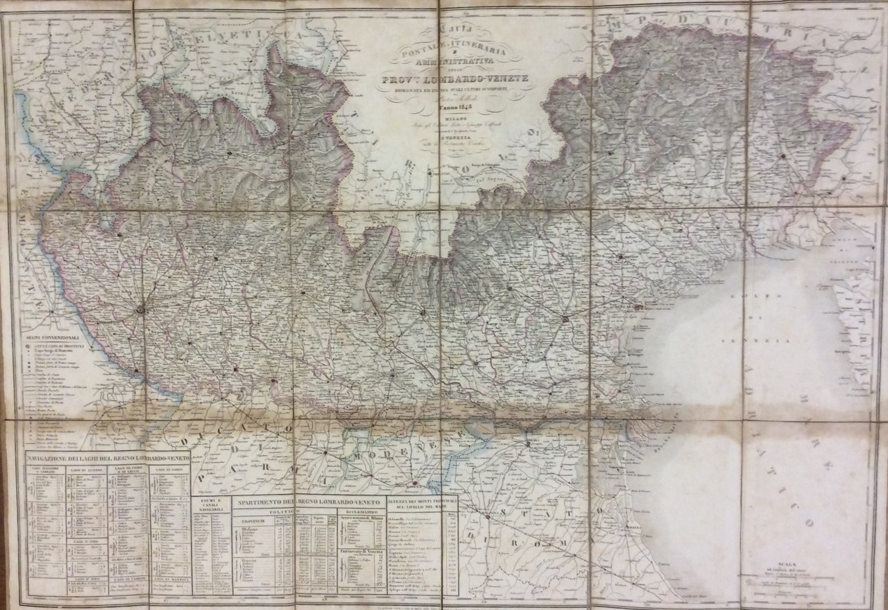 Grande carta geografica del Lombardo-Veneto inc. in rame, a colori (cm. 60,5x86,2), montata su tela e suddivisa in 18 riquadri (cm. 20,5x14,5 cad.), in scala 1: 500000. Nella parte bassa, da sinistra, figurano 4 tabelle: Navigazione dei laghi del Regno Lombardo-Veneto - Fiumi e canali navigabili - Spartimento del Regno Lombardo-Veneto (politico - ecclesiastico) - Altezza dei monti principali sul livello del mare, oltre a un elenco di segni convenzionali. La carta, più volte ripieg., porta un lieve alone su tutta la larghezza, di 3/4 cm. ma certamente è un buon esemplare.