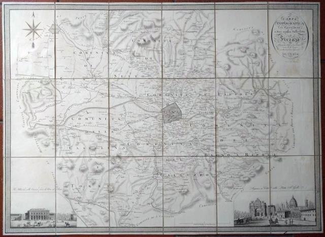 Firenze, presso Niccolò Pagni (s. d. ma 1810 circa). Disegnata da Girolamo Ermirio, incisa da Giuseppe Canacci, e scritta da Gaetano Giarré. Incisione in rame all'acquaforte applicata su tela e divisa in 18 riquadri, b/n, cm 60,5 x 82,5, titolo entro ovale in alto a destra, due vedute animate e finemente incise agli angoli inferiori (sulla sinistra “ R. Palazzo delle Cascine fuori di Porta al Prato”; sulla destra “Ingresso in città dalla Porta San Gallo”), doppio filetto a chiusura intorno al perimetro, astuccio in cartone marezzato con costola in verde. Bella e non comune. Un lieve ingiallimento e alcune imperfezioni della carta intorno al cartiglio e più sotto lungo il margine destro (leggerissimi e contenuti punti di abrasione), peraltro buono lo stato di conservazione.