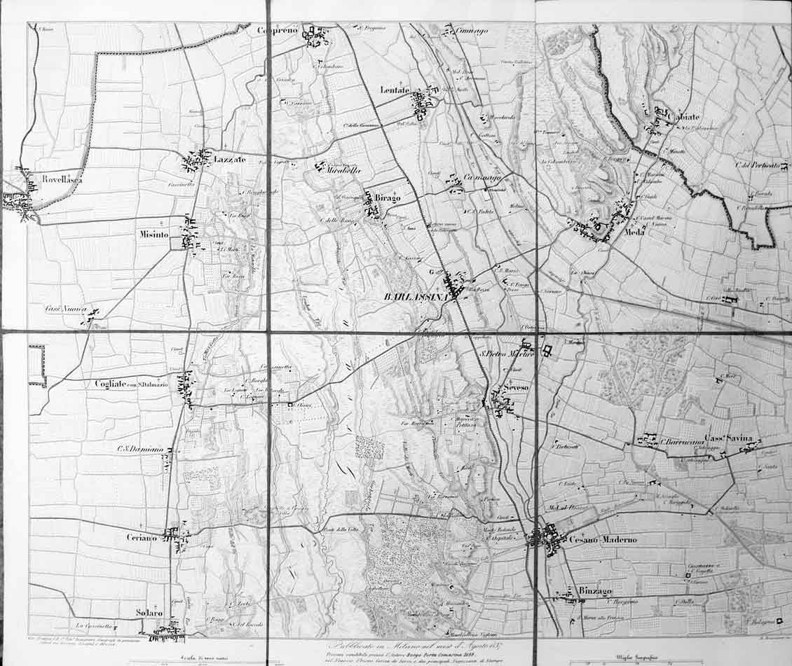 Carta topografica (cm. 36,8 x 43), suddivisa in 6 rettangoli, telata e ripiegata, disegnata e prodotta dall'Ing. geografo Giovanni Brenna, incisa da R. Bressanini, pubblicata a Milano nel mese di agosto 1837. Sono evidenziati: Cogliate - Barlassina - Cesano Maderno. Ben conservata.