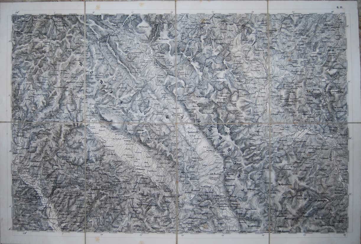Carta di cm. 47 x 71, incisa e montata su tela, divisa in 8 riquadri. Scala 1:86.400. Fa parte della: Carta Topografica dello Stato Pontificio e del Gran-Ducato di Toscana. Costrutta sopra misure astronomico trigonometriche ed incisa sopra pietra a Vienna.Ben conservata.