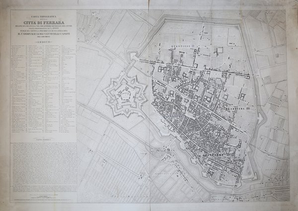 Pianta topografica della città di Ferrara stampata a Roma sotto la Direzione Generale del Censo.Viene dedicata a Luigi Vannicelli Casoni (Amelia, 16 aprile 1801 – Roma, 21 aprile 1877), cardinale e arcivescovo cattolico italiano. Papa Gregorio XVI lo elevò al rango di cardinale nel concistoro del 24 gennaio 1842. Nel 1850, dopo la morte del cardinale Cadolini, fu nominato arcivescovo di Ferrara. A seguito della caduta della repubblica romana fu uno dei membri del triumvirato di cardinali (assieme ai cardinali Gabriele Sermattei della Genga e Lodovico Altieri) che governò Roma durante l'assenza di papa Pio IX ancora esule a Gaeta. Dal 1870 fu a capo della Dataria apostolica. Incisione in rame, stampata su due grandi fogli di carta poi uniti, in ottimo stato di conservazione.Opera molto rara. Pianta topografica della città di Ferrara stampata a Roma sotto la Direzione Generale del Censo.Viene dedicata a Luigi Vannicelli Casoni (Amelia, 16 aprile 1801 – Roma, 21 aprile 1877), cardinale e arcivescovo cattolico italiano. Papa Gregorio XVI lo elevò al rango di cardinale nel concistoro del 24 gennaio 1842. Nel 1850, dopo la morte del cardinale Cadolini, fu nominato arcivescovo di Ferrara. A seguito della caduta della repubblica romana fu uno dei membri del triumvirato di cardinali (assieme ai cardinali Gabriele Sermattei della Genga e Lodovico Altieri) che governò Roma durante l'assenza di papa Pio IX ancora esule a Gaeta. Dal 1870 fu a capo della Dataria apostolica. Incisione in rame, stampata su due grandi fogli di carta poi uniti, in ottimo stato di conservazione.Opera molto rara. Cfr.