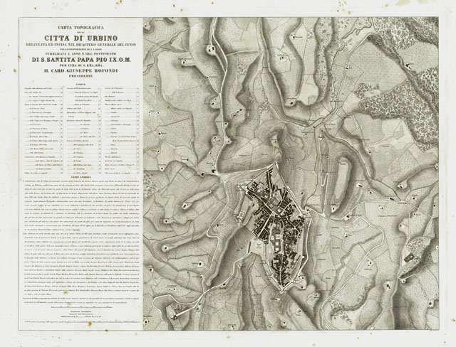 Grande carta raffigurante la topografia della città di Urbino e delle zone circostanti. Incisa nel dicastero generale del censo nella proporzione di 1 a 4000 e pubblicata il decimo anno del Pontificato di S. Santità Papa Pio IX per cura del presidente Card. Giuseppe Bofondi. Sotto al titolo, indice della carta con 62 rimandi ed alcuni cenni storici