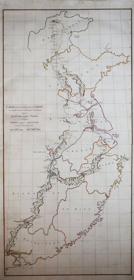 Carte d'une Partie de la Chine sur Laquelle est Tracee la Route qu'a Suivie l'Auteur Depuis Quanton Jusqu'a Peking et Depuis Peking Jusqu'a Quanton. Questa rara carta in due fogli raffigura il viaggio di de Guignes attraverso la Cina orientale da Canton (Guangzhou) a Pechino e ritorno. Sono ben dettagliati i laghi, i fiumi, le montagne e le città lungo il percorso, e sono segnate anche le date del viaggio. Una nota al largo dell'attuale provincia di Hebei (qui chiamata Petchely) raffigura il luogo in cui George Macartney, il primo inviato della Gran Bretagna in Cina, ancorò la sua nave nel 1793. La famosa ambasciata di Macartney mirava ad allentare le restrizioni commerciali tra la Gran Bretagna e la Cina, ma non ebbe successo. Tratta dal resoconto di viaggio di C.L.J. de Guignes Voyages à Péking, Manille et L'Île de France, faits dans l'interval des années 1784 à 1801. Parigi, 1808. Si basa sul lavoro di Alessandro Malaspina. La spedizione Malaspina (1789-1794) fu un'esplorazione scientifica marittima di cinque anni comandata da Alessandro Malaspina e José de Bustamante y Guerra. La mappa è stata realizzata sulla base delle informazioni che Chrétien-Louis-Joseph de Guignes ha ottenuto da un membro della spedizione. ' Nel 1792, la spedizione di Malaspina salpò dal Messico per attraversare l'Oceano Pacifico. Fece una breve sosta a Guam prima di arrivare nelle Filippine, dove trascorse diversi mesi, soprattutto a Manila. Dopo le Filippine, la spedizione salpò per la Nuova Zelanda, rimanendo in Australasia e nel Pacifico meridionale. Durante il viaggio, de Guignes fece osservazioni sulla storia, la società e la cultura cinese, la geografia, l'economia e la produzione. Al suo ritorno in Francia nel 1801, de Guignes pubblicò un resoconto dei suoi 17 anni di viaggi attraverso la Cina, le Filippine e le Mauritius, che includeva due mappe di interesse filippino, incise da D'Houdan, apparse nell'atlante che accompagnava il suo resoconto di viaggio, Voyages à Peking, Manille et L'Ile de France faits dans l'Intervalle des Années 1784 à1801, pubblicato a Parigi nel 1808. Acquaforte, finemente colorata a mano, in buono stato di conservazione. Carte d'une Partie de la Chine sur Laquelle est Tracee la Route qu'a Suivie l'Auteur Depuis Quanton Jusqu'a Peking et Depuis Peking Jusqu'a Quanton. This scarce two-sheet map depicts de Guignes' journey through eastern China from Canton (Guangzhou) to Beijing and back. There is good detail of lakes, rivers, mountains and towns along the route, and travel dates are also marked. A note offshore of present-day Hebei province (here called Petchely) depicts where George Macartney, the first envoy of Great Britain to China, anchored his ship in 1793. The famous Macartney Embassy was aimed at easing trade restrictions between Great Britain and China but was unsuccessful. From de Guignes C.L.J. Voyages à Péking, Manille et L'Île de France, faits dans l'intervalle des années 1784 à 1801. Paris, 1808. The map is based upon the work of Alessandro Malaspina. The Malaspina Expedition (1789–1794) was a five-year maritime scientific exploration commanded by Alessandro Malaspina and José de Bustamante y Guerra. The map is drawn from information derived by Chrétien-Louis-Joseph de Guignes from a member of the Malaspina expedition. ' In 1792, Malaspina's expedition sailed from Mexico across the Pacific Ocean. They stopped briefly at Guam before arriving at the Philippines, where they spent several months, mostly at Manila. After the Philippines, the Malaspina expedition set sail for New Zealand, remaining in Australasia and the South Pacific for the remainder of the expedition. During his journey, de Guignes made observations on Chinese history, society and culture, geography, economics, and manufacturing. Upon returning to France in 1801, de Guignes published an account of his 17 years of travels through China, the Philippines, and Mauritius, which included two maps of Philippine interest, engraved by D'Houdan, which appeared in the atlas to accompany his travel account, ' Voyages à Peking, Manille et L'Ile de France faits dans l'Intervalle des Années 1784 à1801, published in Paris in 1808. Cfr.