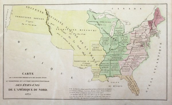 Incisione in rame, mm 370x640, dipinta d’apoca. Importante carta che raffigura le successive degli stati alla federazione degli Stati Uniti nei vari periodi storici. I primitivi stati ed il Vermont sono in rosa, la Florida, acquisita dalla Spagna nel 1819 è colorata in arancione; I territori oltre i monti Appalachi in verde, mentre quelli oltre il Mississipi sono raffigurati in giallo. La carta è tratta da Atlas geographique, statistique, historique et chronologique des deux Ameriques. Mostra lo sviluppo degli Stati Uniti due generazioni dopo la rivoluzione e da precisi dati su ogni stato: capitale, abitanti. Ottimo stato di conservazione.