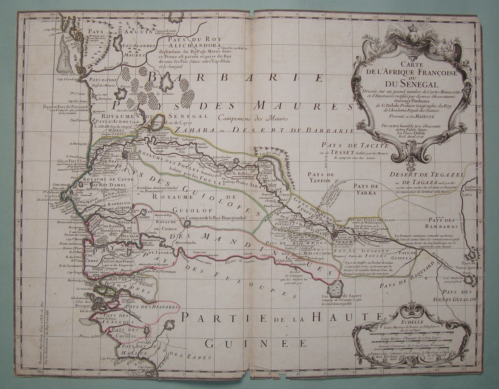 DELISLE Guillaume.Carte de l’Afrique Francoise ou du Senegal. 1726. Double page engraved map by Delisle. Contemp. hand coloured in outline. Inches 18 1/2x23 3/4 (Cm.47x60). No margins.