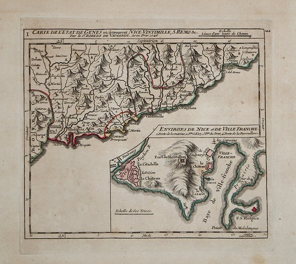 Carta geografica della liguria tratta da "Gilles Robert de Vaugondy, Atlas portatif universel et militaire", Paris, Durand & Pissot, 1748-1749.Incisione in rame, coloritura coeva dei contorni, in buono stato di conservazione. Carta geografica della liguria tratta da "Gilles Robert de Vaugondy, Atlas portatif universel et militaire", Paris, Durand & Pissot, 1748-1749.Incisione in rame, coloritura coeva dei contorni, in buono stato di conservazione. Cfr.