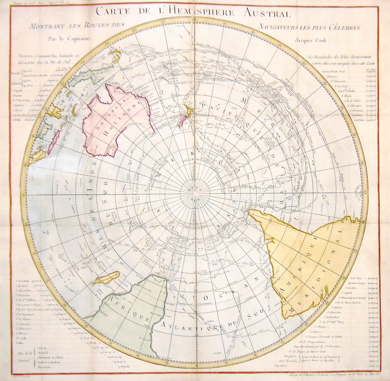 Incisione in rame raffigurante l'emisfero australe, con i tracciati delle rotte scoperte dai navigatori più famosi; colorata a mano, mm 560x575. Tratta da "Histoire generale de voyages" di Prevost. Bell'esemplare con restauro di strappi alle estremità delle pieghe.