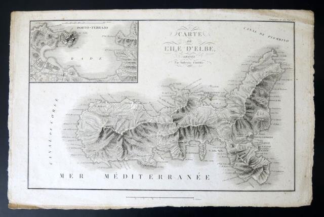 Tratta da "Campagne de 1801", Tome 1. Incisione in rame all'acquaforte, 1820 circa, b/n, cm 27 x 41 circa (alla lastra), in rettangolo in alto a sinistra la Rade de Porto - Ferrajo. Ambroise Tradieu (1788 - 1841) cartografo del governo francese. Carta vergata priva di filigrana, margini irregolari e leggermente ingialliti, lievissimo foxing, inciso in buono stato di conservazione. .