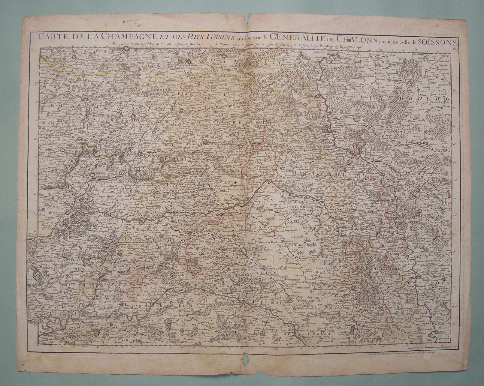 DELISLE Guillaume. Carte de la Champagne et des pays voisins ou lon voit la Generalite de Chalons partie de celle de Soisson. Paris, 1713. Double page engraved map by Delisle. Contemp. hand coloured in outline. Brownings. Inches 18 x 24 1/2 (Cm. 46 x 62). Tears.
