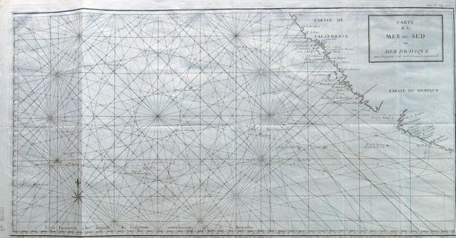 Tratta dal “A Voyage round the word. In the Years MDCCXL, I, II, III, IV. By George Anson, Esq; Now Lord Anson.” (London, printed for the Author, 1749). Incisione in rame all'acquaforte (incisa dal Lattre), b/n, cm 29,5 x 55,8 circa (alla lastra), piccolo cartiglio in alto a destra, margine graduato sul laterale sinistro e sull'inferiore. Oltre a tutte le isole e agli scandagli di mare sono raffigurate le coste della California (“Partie de Californie”) e le Coste del Messico (“Partie du Mexique”). Anson George (1697 – 1762). Usuali pieghe editoriali, strettissimi margini, molto buono lo stato di conservazione. .