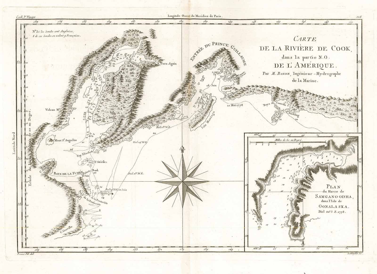 Carta geografica raffigurante il tratto di costa dell'Alaska esplorato dal Capitano Cook durante il suo terzo viaggio a bordo della Resolution il giorno 12 maggio del 1778. Nell'angolo in basso a destra in riquadro graduato particolare della baia di Samgano Odha.Rigobert Bonne (1727-1795) fu uno dei più importanti cartografi del tardo XVIII secolo. Nel 1773 succedette a Jacques Bellin come cartografo reale in Francia.