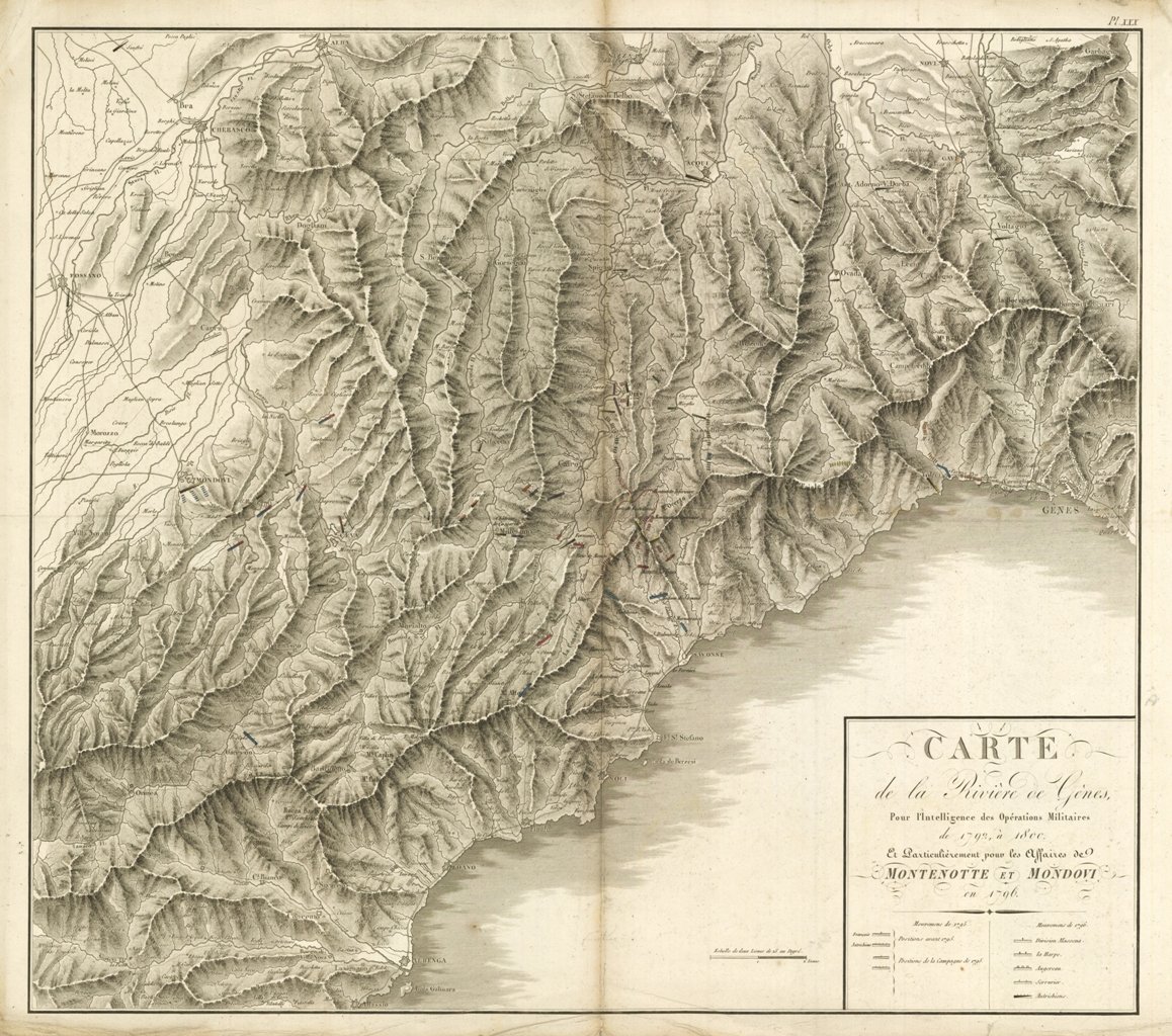 Carta geografica del basso Piemonte e della Liguria da Alassio a Genova, con evidenziati gli schieramenti militari della campagna Napoleonica del 1796