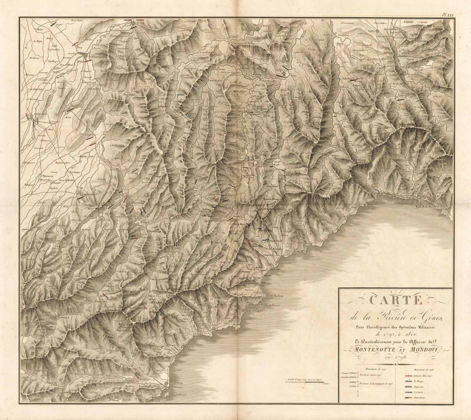 Carta geografica raffigurante la porzione di territorio della riviera ligure compresa tra Genova ed Alassio. Il disegno, nell'entroterra, giunge, sulla sinistra fino ad Alba, mentre sulla destra fino a Novi. L'incisione si presenta particolarmente interessante per via della raffigurazione delle posizioni delle truppe francesi ed austriache nella campagna del 1795 e soprattutto per i movimenti del 1796 della Divisione Massena, la Harpe, Augereau, Serrurier, e delle truppe austriache. Pieghe edittoriali, coloritura coeva delle diffrenti divisioni.