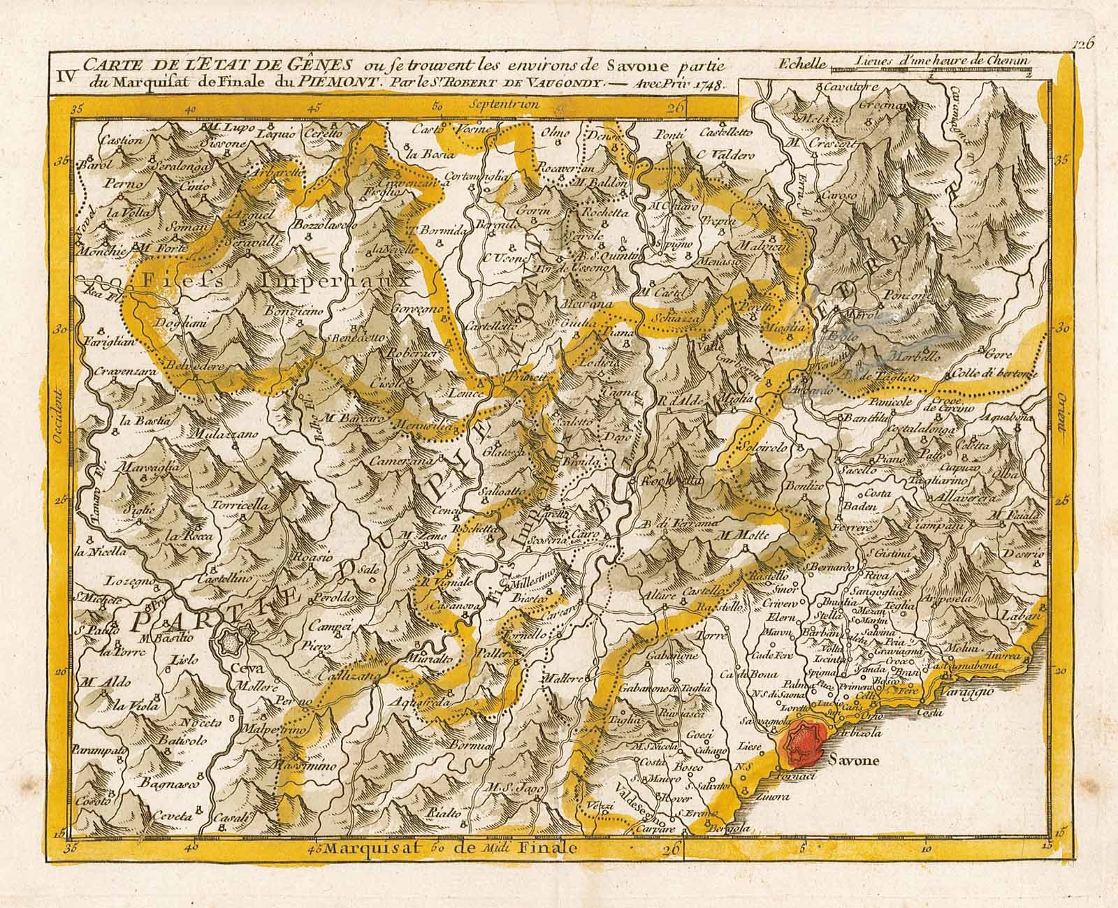 Piccola e graziosa carta geografica raffigurante la porzione di territorio litorale con la cittadina di Savona, mentre nella parte interna si vede una porzione del Piemonte e parte del Basso Monferrato. L'incisione è caratterizzata da una vivace coloritura coeva all'acqerello. Piega centrale editoriale