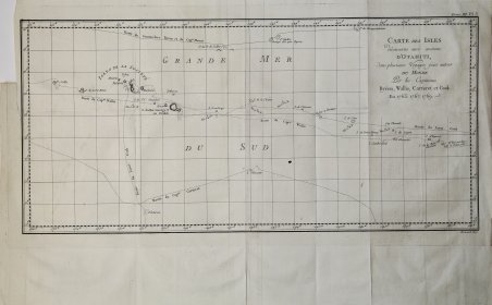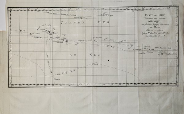 Carta geografica tratta dall'atlante della relazione di James Hawkesworth "Cartes et figures des voyages entrepris par ordre de sa Majesté Britannique pou fair des découvertes dans l'hémisphère méridional; exécutes par Byron, Carteret, Wallis & Cook dans les vaisseaux le Dauphin, Le Swallow & l'Endeavour" pubblicata in più edizioni di lingua francese, inglese, olandese ed italiano. Incisione in rame, in ottimo stato di conservazione. Map taken from the atlas by James Hawkesworth "Cartes et figures des voyages entrepris par ordre de sa Majesté Britannique pou fair des découvertes dans l'hémisphère méridional; exécutes par Byron, Carteret, Wallis & Cook dans les vaisseaux le Dauphin, Le Swallow & l'Endeavour" published in more edition in french, english, duth and italian. Fine map shows the explorations of Captain Cook, Captain Byron, Captain Wallis and Captain Carteret in the vicinity of Tahiti and the Society Islands from 1765 to 1769. Extends from Is. Scilly [i.e. the Scilly Islands] in the west and to I. Whitsunday de la Pentecote [i.e. the Whitsunday Island] in the east, from Is. du Disappointment [i.e. Disappointment Island] in the north to Ohetiroa in the south. Features the routes taken by these important explorers as the zig-zagged in and around the Society Islands. Depicts the island of Tahiti (Otaheite) as well as Bora Bora (Bolabola), Otaha, Marma, Ulietea, and others. Title in decorative script in the upper right quadrant. Copper engraving, in excellent condition. Cfr.