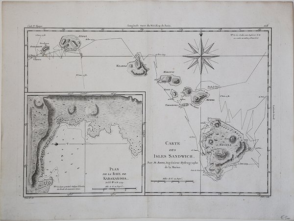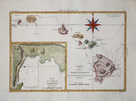 Mappa delle Hawaii di Cook. All'interno vengono mostrate le varie tappe del passaggio di Cook attraverso le isole, comprese di date, oltre che le caratteristiche topografiche delle isole e un grande inserto dedicato alla Baia di Karakakooa.Cook lasciò le Hawaii nel 1779, dopo aver visitato la maggior parte delle isole principali e aver fatto un lavoro di mappatura molto accurato. Il grande dibattito su questa mappa riguarda il fatto se il lavoro sia stato realizzato da Henry Roberts o William Bligh. Mentre il testo dell'Official Account of Cook's Third Voyage accredita Henry Roberts come autore delle mappe, la copia del British Hydrographical Office dell'Official Account include un'annotazione a mano di Henry Bligh, in cui afferma di essere stato l'autore di questa mappa e di aver realizzato le mappe delle Hawaii.La mappa è apparsa nel Bonne's Atlas Supplement, pubblicato a Parigi nel 1787, che comprende nel Volume II molte delle mappe derivate dai tre viaggi di Cook. Rigobert Bonne (1727-1795) è stato uno dei più importanti cartografi della fine del XVIII secolo. Nel 1773 successe a Jacques Bellin come cartografo reale di Francia nell'ufficio dell'idrografo del Dipartimento della Marina. Lavorando in veste ufficiale, Bonne compilò alcune delle mappe più dettagliate e accurate dell'epoca. Il lavoro di Bonne rappresenta un passo importante nell'evoluzione dell'ideologia cartografica, che si allontana dal lavoro decorativo del XVII e dell'inizio del XVIII secolo per passare a un'estetica più orientata al dettaglio e alla pratica. Per quanto riguarda la resa del terreno, le carte di Bonne presentano molte somiglianze stilistiche con quelle del suo predecessore, Bellin. Tuttavia, le mappe di Bonne abbandonano in genere le caratteristiche decorative comuni del XVIII secolo, come la colorazione a mano, gli elaborati cartigli decorativi e le rose delle bussole. Pur concentrandosi principalmente sulle regioni costiere, il lavoro di Bonne è molto apprezzato per i suoi dettagli, l'importanza storica e l'estetica generale. L'Atlas Encyclopédique, ' opera che il Bonne portò a termine con l'ausilio di Nicholas Desmarest, costituisce il suo lavoro di maggior fama. Incisione in rame, finemente colorata a mano, in ottimo stato di conservazione. Striking full color example of Cook's first map of Hawaii, showing Cook's tracks through the Islands, including dates, topographical features of the islands and a large insert of Karakakooa Bay.Cook left Hawaii in 1779, after coasting most of the major islands and having done a remarkably accurate job of mapping the islands for a first visit. The great debate regarding this map is whether the work was done by Henry Roberts or William Bligh of Mutiny on the Bounty Fame. While the text of the Official Account of Cook's Third Voyage credits Henry Roberts as the surveyor and maker of the charts, the British Hydrographical Office copy of the Official Account includes a manuscript annotation in Henry Bligh's own hand, wherein Bligh claims to have been the maker of this map and to have constructed the maps of Hawaii.The present example appeared in Bonne's Atlas Supplement, published in Paris in 1787, which includes many of the maps derived from Cook's three voyages in Volume II. Rigobert Bonne (1727-1795) was one of the most important cartographers of the late 18th century. In 1773 he succeeded Jacques Bellin as Royal Cartographer to France in the office of the Hydrographer at the Depôt de la Marine. Working in his official capacity Bonne compiled some of the most detailed and accurate maps of the period. Bonne's work represents an important step in the evolution of the cartographic ideology away from the decorative work of the 17th and early 18th century towards a more detail oriented and practical aesthetic. With regard to the rendering of terrain Bonne maps bear many stylistic similarities to those of his predecessor, Bellin. However, Bonne maps generally abandon such common 18th century decorative features such as hand coloring, elaborate decorative cartouches, and compass roses. While mostly focusing on coastal regions, the work of Bonne is highly regarded for its detail, historical importance, and overall aesthetic appeal. The Atlas Encyclopédique, that Bonne completed with the help of Nicholas Desmarest, constitutes his most famous work. Copperplate with fine later hand colour, very good condition. Cfr.