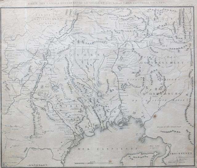 Paris, Maradan, 1794. Tratta dalla seconda edizione francese del “Voyages du Professeur Pallas, dans Plusieurs Provinces de l'Empire de Russie et dans l'Asie Septentrionale” di Peter Simon Pallas (opera per la prima volta pubblicata in Germania a St. Petersbourg fra il 1771 e il 1776 e in seconda edizione, nonché la prima francese, fra 1788 e il 1793), interamente incisa dal Tardieu. Incisione in rame all'acquaforte, b/n, cm 38,5 x 45 (il foglio). La mappa relativa al Mar Caspio, include le terre fra il Volga e la catena montuosa dell' Oural che fa tradizionalmente da limite geografico e da spartiacque fra l'Europa e l'Asia; sono segnalate le città di Astrakhan, nella Russia meridionale, e Orenbourg, situata al limite orientale della parte europea sul fiume Ural. Pallas, of German origin, was a member of the Russian Academy of Sciences and on request of the Russian government explored the lesser-known provinces of the Russian Empire. His travel books opened up Russia to the West and served as a model for 18 th-century for travel literature. Stretti margini, uniforme ingiallimento, buono stato.