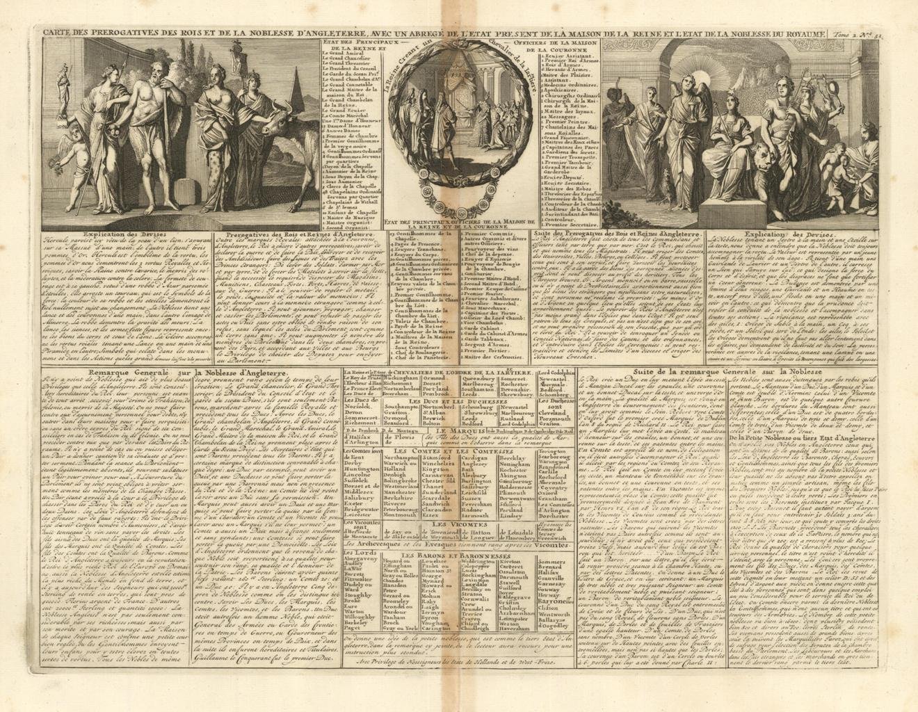 Raffigurazione ed esplicazione, antica ed originale, dei privilegi dei Re e della Nobiltà inglese. Si trova inserita nel III Tomo ”Atlas Historique ou nouvelle introduction a l’Histoire, à la Chronologie & à la Geographie Ancienne & Moderne…”, pubblicato ad Amsterdam nel 1708. Atlante che, con la sua pubblicazione, coniuga le mappe geografiche con incisioni e informazioni di carattere geografico, araldico, etnografico e storico così rendendo l’opera in sette volumi molto innovativa.Henri Abraham Chatelain (1684 - 1743), pastore ugonotto originario di Parigi visse alternativamente a Parigi, Londra, L'Aia ed Amsterdam. Conosciuto come cartografo olandese per il sua opera cartografica monumentale in sette volumi “Atlas Historique” pubblicata ad Amsterdam con i suoi fratelli.