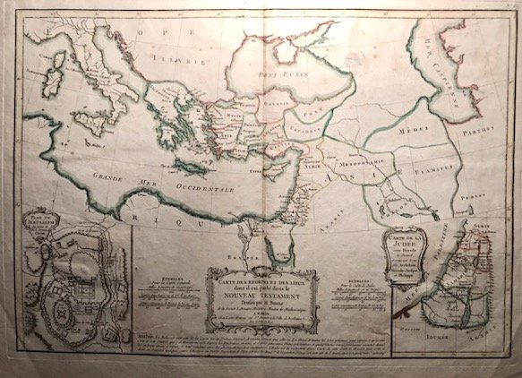 Carta geografica originale (cm. 46x32 più ampi margini bianchi). Coloritura d’epoca all’acquarello dei confini. Lieve traccia di piega editoriale centrale, peraltro esemplare in ottimo stato di conservazione. Nella parte inferiore a destra ‘Carte de la Judée sous Herode le Grand.’, a sinistra ‘Plan de Jerusalem du tems de N.S. Jesus Christ’.
