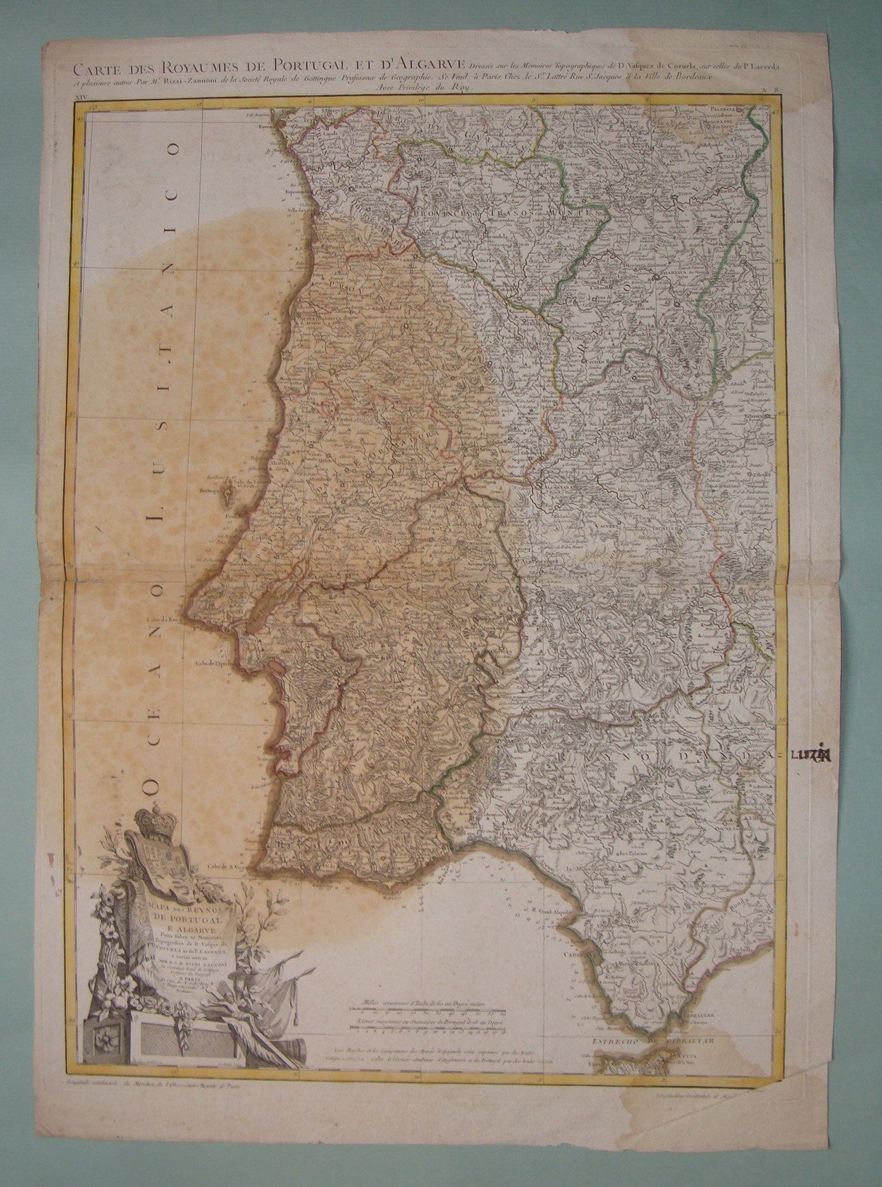RIZZI ZANNONI. Carte des Royaumes de Portugal et d’Algarve. Mapa dos Reynos de Portugal e Algarve. Paris, 1810 ca., Double page engraved map by Lattrè after Rizzi Zannoni. Wide brownings. Original hand coloured in outline. Cartouche. Inches 17 3/4 x 24 1/2(Cm. 45x62).
