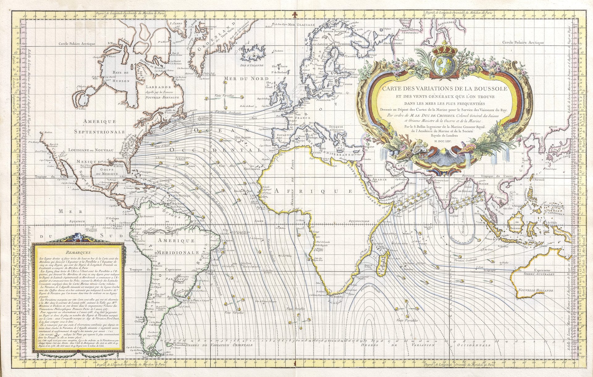 Incisione in rame, mm 550x875, dipinta a mano ad acquerello. Bella carta del mondo che mostra le variazioni magnetiche della bussola, una delle prime carte del mondo francesi ad illustrare le variazioni magnetiche. Primo stato della lastra con il cartiglio raffigurante lo stemma reale con i 3 fleur-de-lis. Una carta marittima elegantemente disegnata e redatta con precisione degli oceani navigati dai navigatori francesi nel XVIII secolo. Disegnata da J. N. Bellin (1703-1772), che durante i suoi oltre cinquant'anni di lavoro presso il Servizio idrografico francese fu nominato primo "Ingenieur hydrographe de la Marine". Questa carta si estende dalla California al Giappone e si concentra sugli oceani Atlantico e Indiano. La sfera di influenza francese nelle Indie Occidentali, in Africa e in India avrebbe generato questo interesse per le variazioni di bussola e vento applicate a una proiezione di Mercatore che copre la maggior parte del mondo. Nel 1765, la Francia aveva perso la maggior parte del suo impero d'oltremare in America a seguito della Guerra dei Sette Anni (Guerra Francese e Indiana in America), quindi la conoscenza delle rotte marittime era importante per mantenere ciò che era rimasto. Oltre a una grande quantità di informazioni idrografiche, tra cui piccole teste di vento, questa splendida carta presenta uno squisito cartiglio con la corona francese che sormonta il globo.<BR>