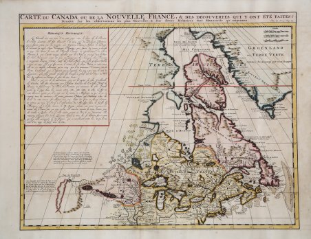 Carta inserita nell'Atlas Historique, pubblicato ad Amsterdam tra il 1705 e il 1720. L'atlante, in 7 volumi, è innovativo per la sua epoca perché combina le mappe geografiche con incisioni e informazioni di carattere geografico, storico, etnografico e araldico. La mappa di Chatelain del Canada è stata la prima mappa stampata a localizzare Detroit, rilasciata per la prima volta solo 2 anni dopo la fondazione del villaggio.L'area intorno alla Baia di Hudson è abitata da tribù native chiamate "Christinaux o Kilistinons", mentre Labrador è la sede degli "Eskimaux".La mappa presenta una serie di note che si riferiscono specificamente ai nomi degli esploratori e alle date in cui hanno scoperto determinati luoghi. Incisione in rame, finemente colorata a mano, in ottime condizioni. Henri Abraham Chatelain (1684 - 1743) era un pastore ugonotto di origini parigine. È meglio conosciuto come cartografo olandese e più specificamente per il suo contributo cartografico nell’Atlas Historique ' in sette volumi, pubblicato ad Amsterdam tra il 1705 e il 1720. Innovativo per il suo tempo, l'Atlas Historique ' combinava incisioni e opere d'arte con studi di geografia, storia, etnologia, araldica e cosmografia. Alcuni studiosi suggeriscono che l'Atlas Historique ' non fu compilato esclusivamente da Henri Chatelain, come si crede comunemente, ma piuttosto fu un'impresa familiare che coinvolse Henri, suo padre Zacharie e suo fratello, sempre Zacharie. Chatelain's map of Canada was the first printed map to locate Detroit, first issued only 2 years after the founding of the Village by Cadillac.The map is one of the most important maps of Canada printed during its time. Numerous trading posts and missions in New France and the major towns of the adjacent British colonies are shown. The area around Hudson's Bay is inhabited by native tribes referred to as the "Christinaux or Kilistinons," while Labrador is home to the "Eskimaux."The map features a number of notes specifically referring to the names of explorers and the dates in which they discovered certain places, such as the reference to 'Nouveau Danemarc', discovered by the Danish explorer, Jan Munk, in 1619. The depiction of the upper Mississippi and Ohio basins is also quite detailed. Taken from "Atlas Historique" published in Amsterdam between 1705 and 1720. ' Henri Abraham Chatelain (1684 - 1743) was a Huguenot pastor of Parisian origins. He is best known as a Dutch cartographer and more specifically for his cartographic contribution in the seminal seven volume ' Atlas Historique, published in Amsterdam between 1705 and 1720. Innovative for its time, the ' Atlas Historique ' combined fine engraving and artwork with scholarly studies of geography, history, ethnology, heraldry, and cosmography. Some scholarship suggests that the ' Atlas Historique ' was not exclusively compiled by Henri Chatelain, as is commonly believed, but rather was a family enterprise involving Henri, his father Zacharie and his brother, also Zacharie. Copperplate, fine later hand colour, in good condition. Cfr.