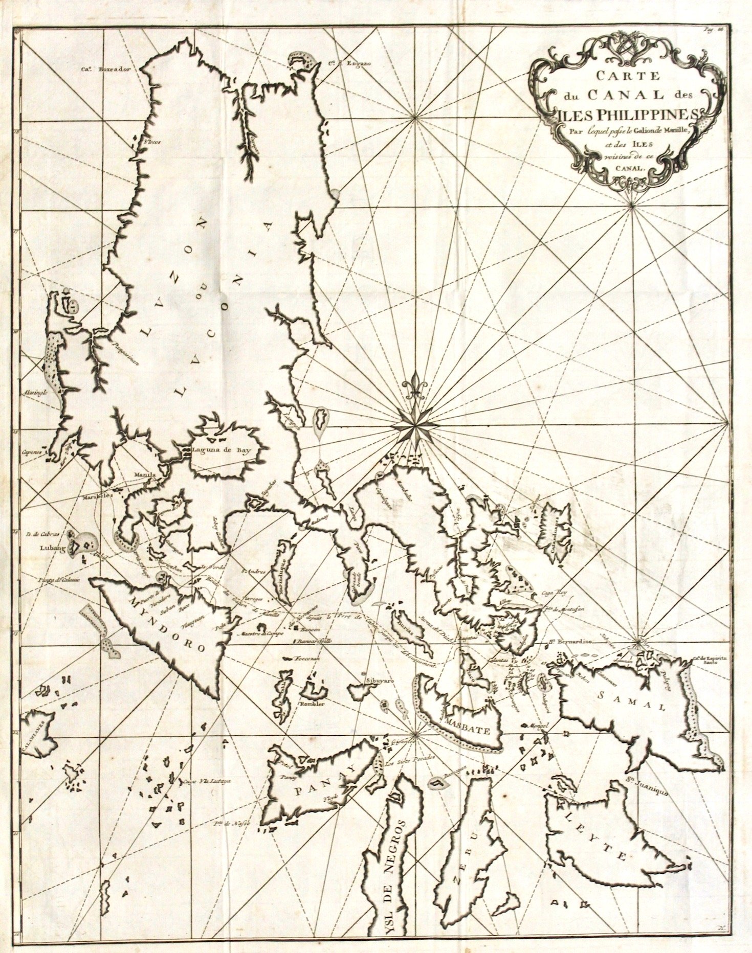 Copper engraving, mm 540x430. From a French edition of Anson's Voyages. This map was published in an account of Commodore George Anson's circumnavigation. The map shows the route of the Manila Galleon from Manila past Mindoro, Ramblon and Masbate to the San Bernadino Straits and the Embocadero out to the Pacific Ocean. Anson chased and captured Nuestra Senora de Cavadonga in 1743. He caught the ship before it reached Manila. This was the only one of 5 Manila galleons captured by the British that was carrying a cargo of Mexican silver. Good condition with traces of original folds. <BR>
