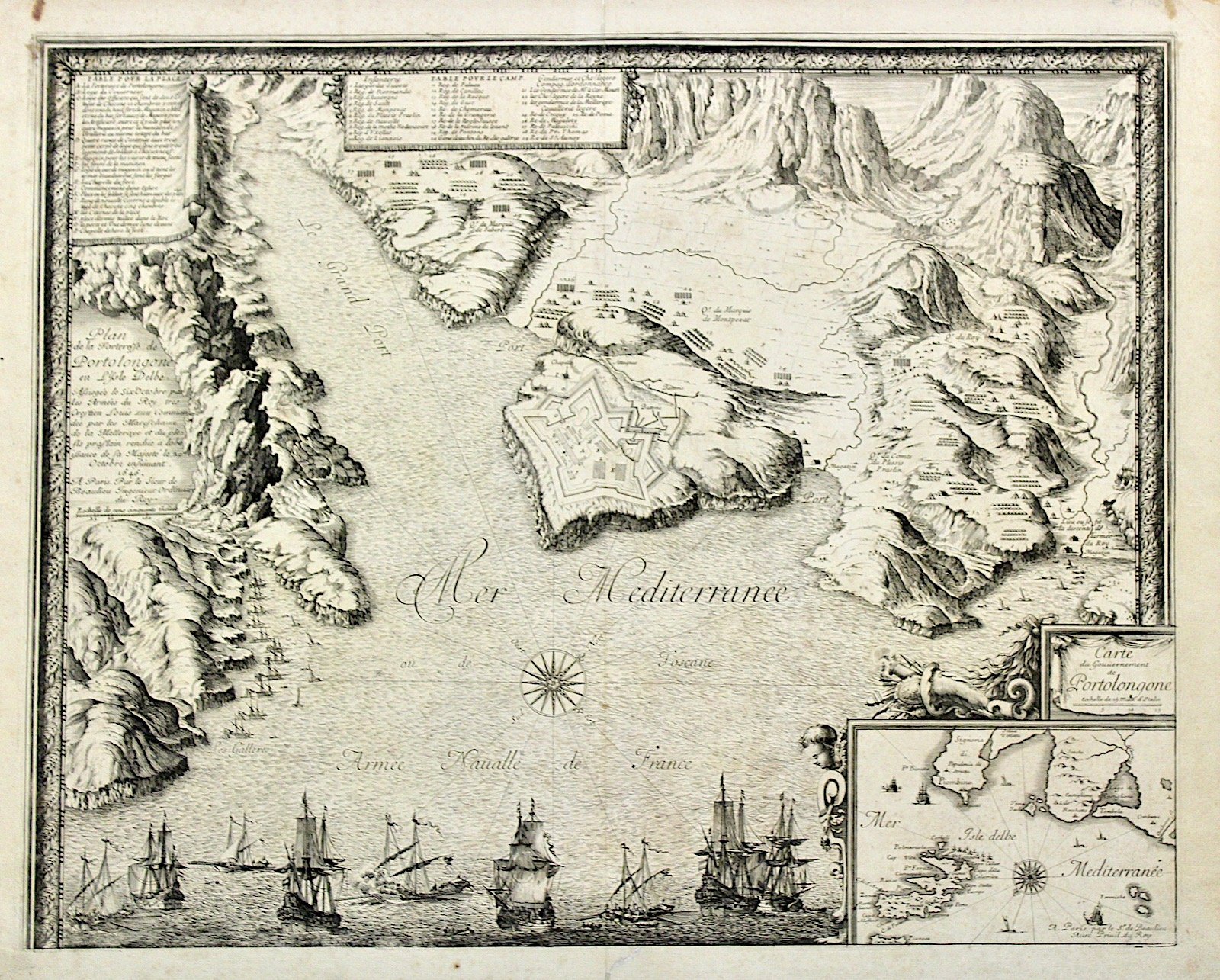 Incisione in rame di mm 430x545, tratta da " Le glorieuses conquistes de Louis le Grand, Roy de France ". Bella cornice ornamentale. Vari cartigli contenenti rimandi numerati alla carta. Scena di battaglia navale in primo piano; sullo sfondo la veduta a volo d'uccello del territorio di Portolongone con la sua fortezza. In basso a destra carta geografica dell'Isola d'Elba. Buon esemplare.<BR>