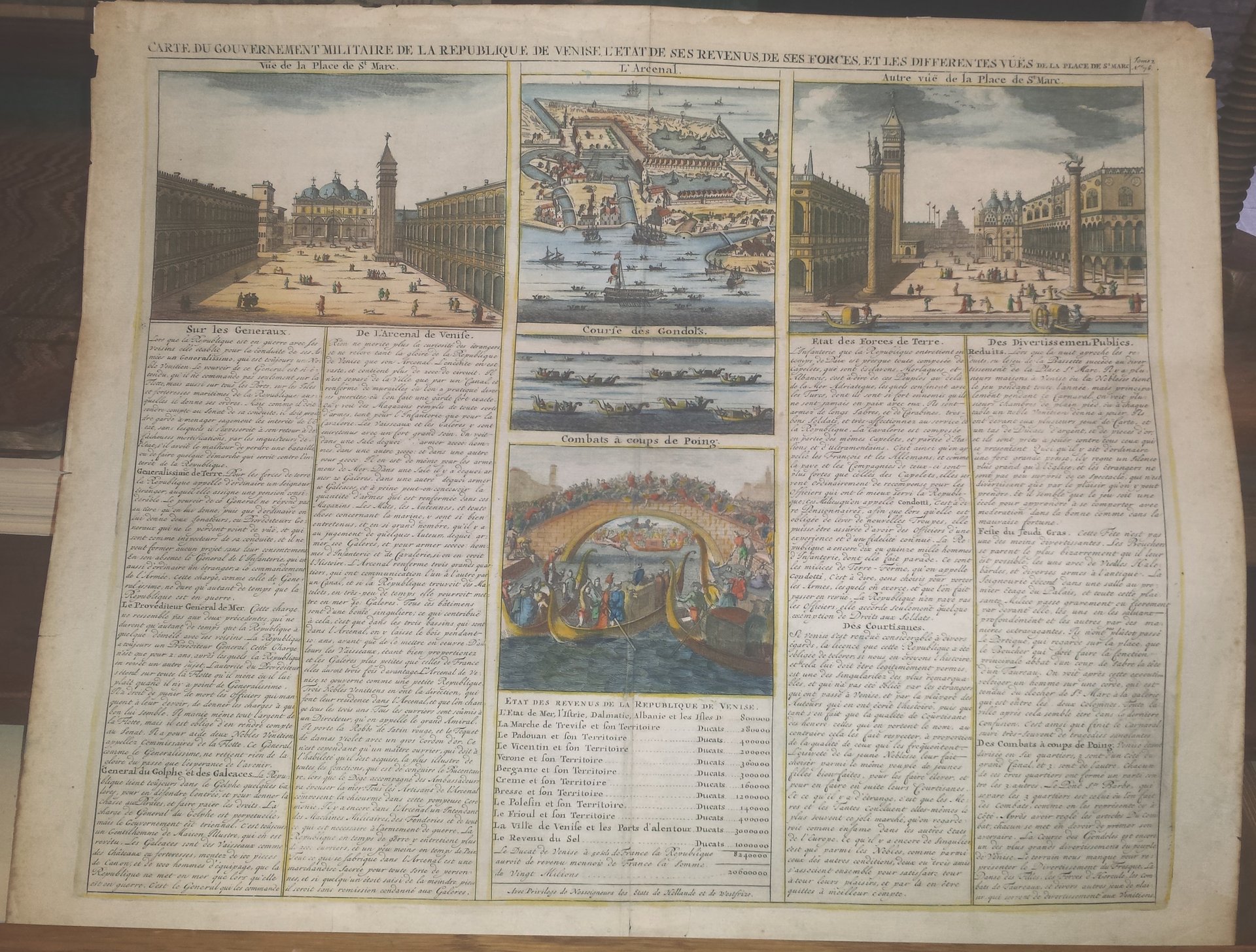 Incisione in rame, 39 x 46,5 cm, acquarellata, foglio 44 x 53 cm. Qualche taglio ai margini bianchi. Contiene le incisioni acquarellate: "Vue de La Place de St. Marc", "L'Arsenal", "Course des Gondol's", "Combats a coups de Poing", "Autre vue de La Place de St. Marc" e dei testi in francese su: "Sur les Generaux", "De L'Arcenal de Venise", "Etat des revenus de la Republique de Venise", "Etat des Forces de Terre" (sotto a questa la dicitura "Avec Privilege de Nosseigneurs des Etats de Hollande et de Westfrize", "Des Diveritissemen Publics". In alto a destra a fianco del titolo "Tome 2 N° 76". Proveniente da “Atlas historique, ou Nouvelle introduction a l'histoire, a la chronologie & a la geographie ancienne & moderne; representee dans de nouvelles cartes, ou l'on remarque l'etablissement des premiers Etats & des plus anciens empires du monde, leur duree, leur chute, & leur differens gouvernemens . Par Mr. C*** avec des dissertations sur l'histoire de chaque Etat, par. Mr. Gueudeville. Tome 2. Seconde partie. Ou tome 3. Qui comprend la Grande Bretagne, l'Irlande, la Suisse, la Sauoye, la Lorraine & la republique de Venise”. Chatelain Henri (1684-1743) pastore ugonotto di origine parigine, cartografo.