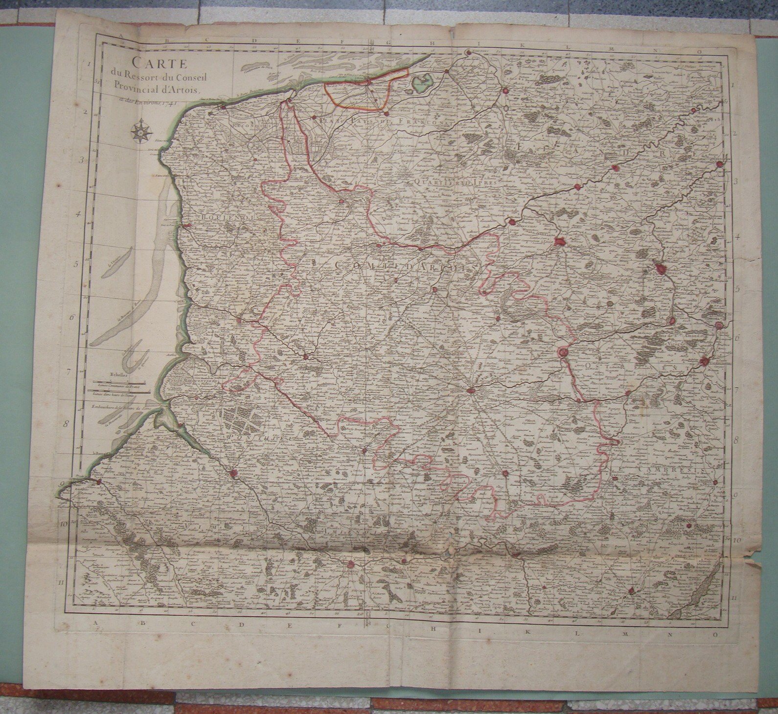 Carte du Ressort du Conseil Provincial d’Artois et des Environs. 1741. Folding engraved map. Contemp. hand coloured in outline. Inches 24 3/4 x 27 1/2 (Cm. 63x70). Tears.