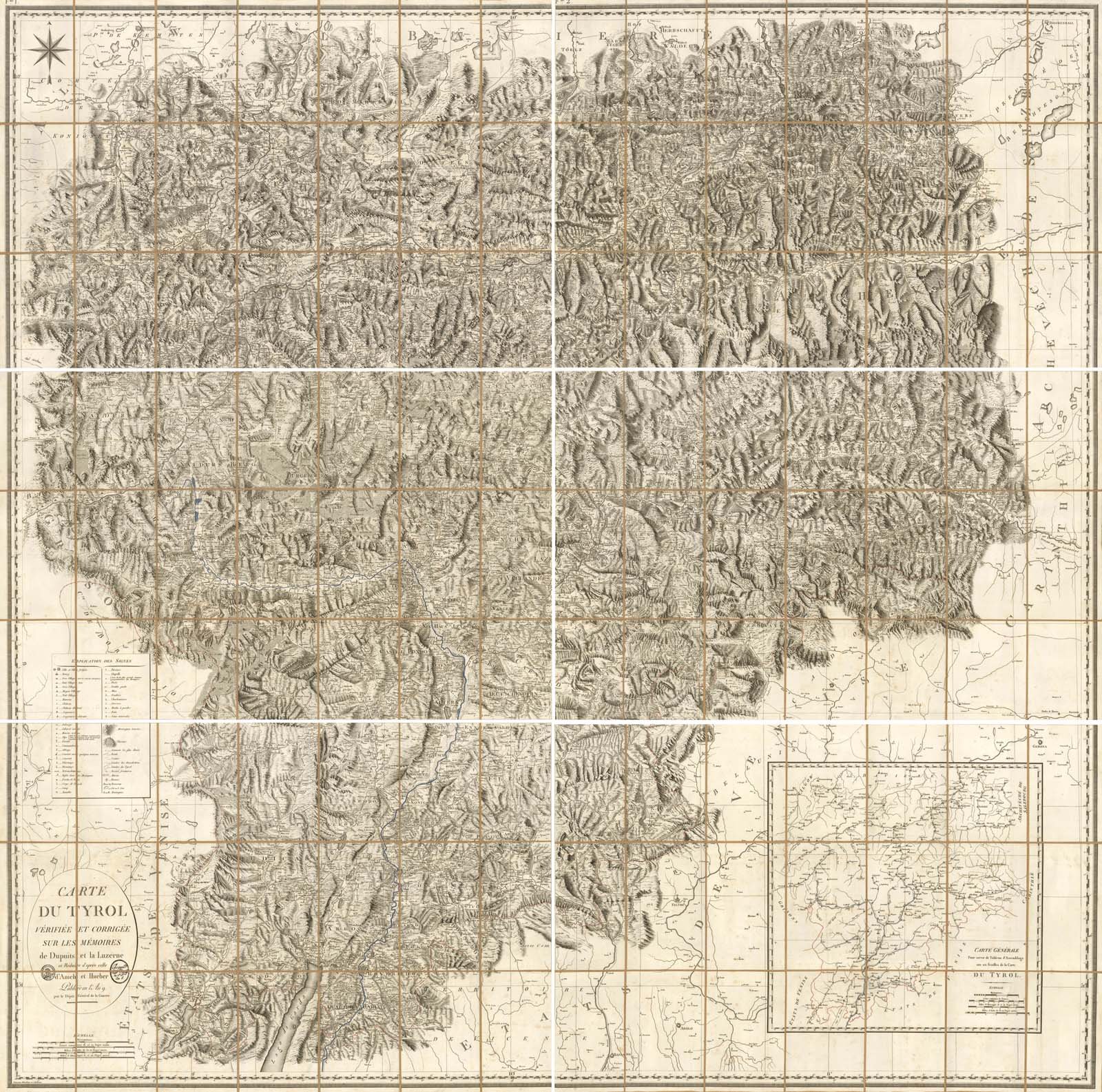Interessante carta geografica raffigurante il territorio del Tirolo e realizzata dal Depot General de la Guerre. Questa si basa sulla carta meglio conosciuta come "Atlas Tyrolensis", la prima carta dell'intera regione realizzata nel 1774 da Ignaz Weinhart, matematico e padre gesuita, con la collaborazione di Peter Anich e Blasius Huber, secondo moderne tecniche topografiche. L'Atlas Tyrolensis venne poi corretta ed aggiornata con le memorie raccolte dal colonnello dei Dragoni Dupuits che in un primo tempo, nel 1773, venne incaricato di verificare la frontiera dei paesi del Tirolo e successivamente intraprese altre due missioni l'una nel 1775 e l'altra nel 1776. Infine furono utilizzate anche le informazioni raccolte nel 1777 dal cavaliere de La Luzerne.I lavori per la realizzazione della presente carta iniziarono nel novembre del 1798, una volta stanziati 4800 franchi, e videro al lavoro i migliori ingegneri e cartografi del Depot Generale de la Guerre. Il risultato è una carta strabiliante per la qualità della raffigurazione e per le numerose informazioni che contiene. La carta si presenta in sei fogli applicati su tela a stacchi e conservata nel suo cofanetto originale. Rif:Tomasi, "Il territorio Trentino Tirolese nell'antica Cartografia", p. 171, n° 86; Tanzarella, "Il Trentino nelle reconnaissances degli ingegneri-geografi francesi." estratto dal Semestrale di Studi e Ricerche di Geografia, fascicolo I, 2011