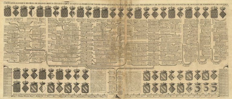 Carte Genealogique des Rois de France depuis Hugues Capet jusqu' a la Famille de Valois ainsi que des Dauphins de Vienois, les Premiers Ducs de Bourgogne, les Seigneurs de Montagu, du Somernon de Couches