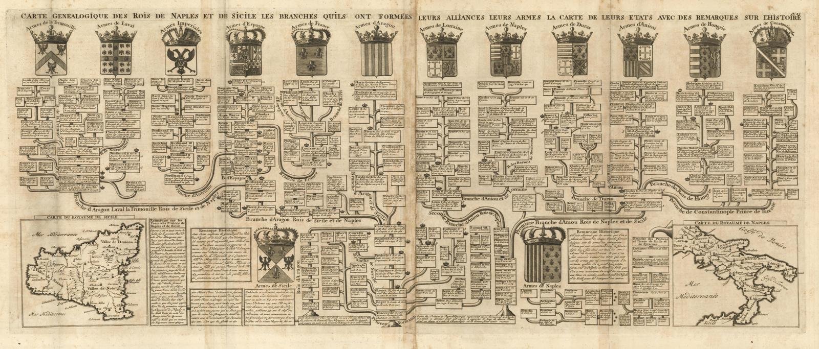 Carte Genealogique Des Seconds Rois De Naples et de Sicile, Les Branches Differentes Branches Quils Ont Formees, Leurs Alliances, Leurs Armes, La Carte De Leurs Etats, Avec Des Remarques Sur L'Histoire