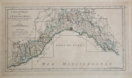 Carta geografica della liguria tratta da "Gilles Robert de Vaugondy, Atlas portatif universel et militaire", Paris, Durand & Pissot, 1748-1749.Incisione in rame, coloritura coeva dei contorni, in buono stato di conservazione. Carta geografica della liguria tratta da "Gilles Robert de Vaugondy, Atlas portatif universel et militaire", Paris, Durand & Pissot, 1748-1749.Incisione in rame, coloritura coeva dei contorni, in buono stato di conservazione. Cfr.