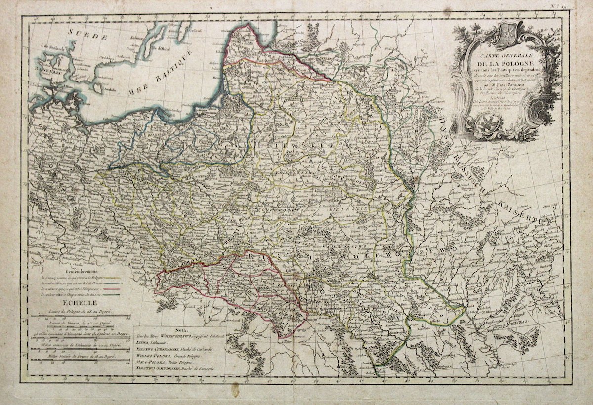 Incisione in rame, dipintra d'epoca, mm 306x455. <BR>Attrattiva carta disegnata da uno dei principali cartografi del tardo Settecento, arricchita da un cartiglio barocco. Rizzi Zannoni, astronomo, matematico, fu il primo a eseguire una triangolazione della Polonia. Tratta da " Atlas Moderne " di Lattrè. Buon esemplare appena ingiallito <BR>Copper engraving, mm 306x455, outline original color. Attractive map of Poland, ornated with a rococo title cartouche. Boundaries outlined in hand colour.<BR>Prepared by Giovanni Antonio Bartolomeo Rizzi Zannoni, one of the leading cartographers of the late 18th century, as well as being an astronomer, surveyor and mathematician.<BR>Rizzi Zannoni was the first to execute the triangulation of Poland.<BR>From"Atlas Moderne" by Lattré. Good condition, just some paper discoloration.