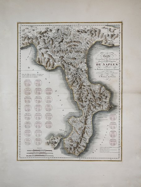 Carta geografica di Jacquest Clermont, stampata a Parigi nel 1780 e pubblicata ' nel “Voyage Pittoresque ou description des Royaumes de Naples et de Sicile" di Richard de Saint-Non, opera in 5 volumi edita, per la prima volta, dal 1781 al 1786. Si basa sulla grande carta del Regno di Napoli di Giovanni Antonio Rizzi Zannoni. Il Voyage Pittoresque fu una vastissima impresa tipografica, i libri dell'opera raccolgono appunti di un diario di viaggio (abilmente assemblati e rimontati, ma non sempre scritti di suo pugno da Saint-Non), corredati da un totale di 542 tavole all’acquaforte. Esemplare tratto dal “Voyage Pittoresque” seconda edizione del 1795/98, priva dell'indicazione del privilegio reale. Incisione in rame, finemente colorata a mano, in ottimo stato di conservazione. Carta geografica di Jacquest Clermont, stampata a Parigi nel 1780 e pubblicata ' nel “Voyage Pittoresque ou description des Royaumes de Naples et de Sicile" di Richard de Saint-Non, opera in 5 volumi edita, per la prima volta, dal 1781 al 1786. Si basa sulla grande carta del Regno di Napoli di Giovanni Antonio Rizzi Zannoni. Il Voyage Pittoresque fu una vastissima impresa tipografica, i libri dell'opera raccolgono appunti di un diario di viaggio (abilmente assemblati e rimontati, ma non sempre scritti di suo pugno da Saint-Non), corredati da un totale di 542 tavole all’acquaforte. Esemplare tratto dal “Voyage Pittoresque” seconda edizione del 1795/98, priva dell'indicazione del privilegio reale. Incisione in rame, finemente colorata a mano, in ottimo stato di conservazione. Cfr.