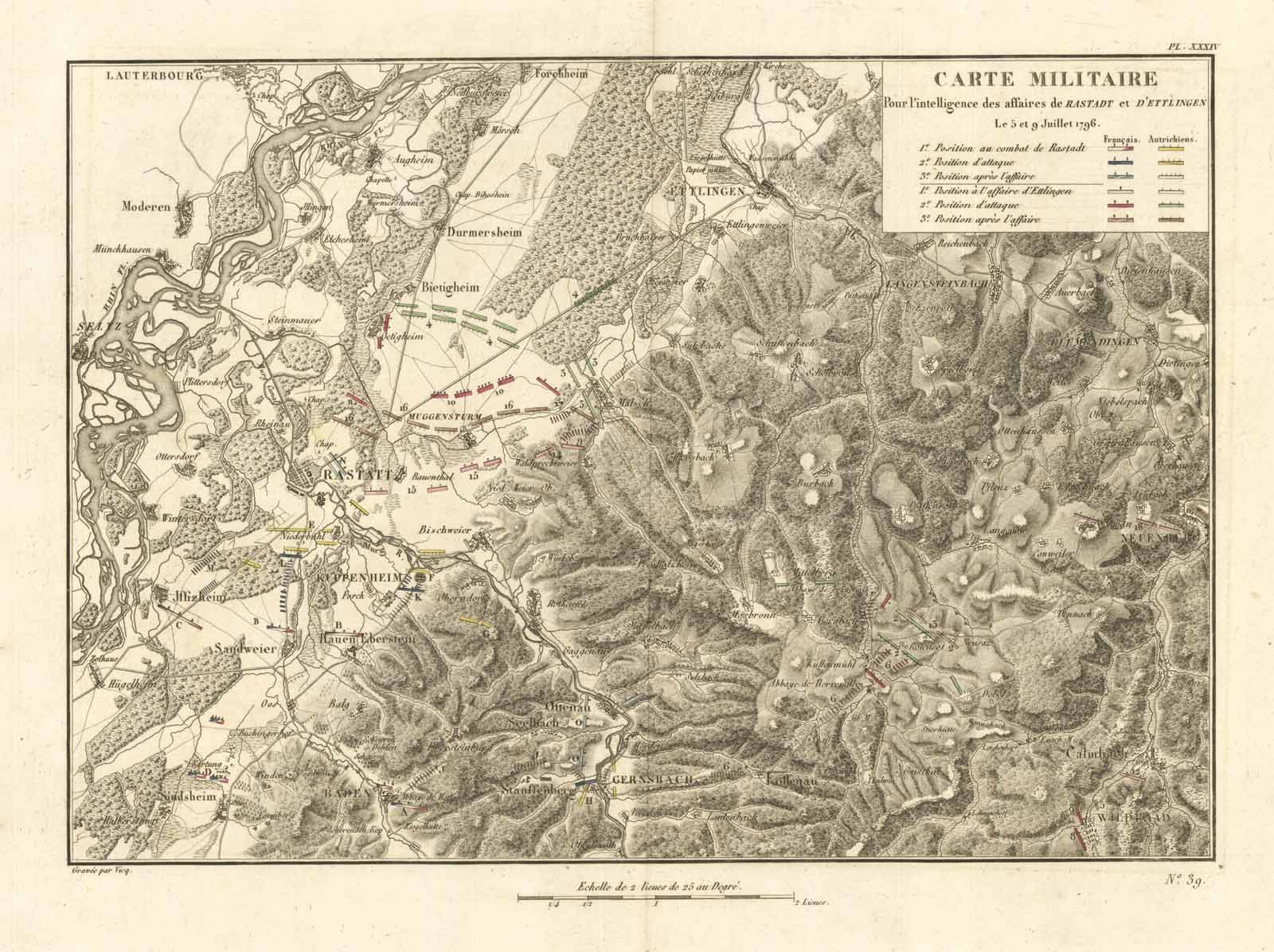 Carta geografica raffigurante i movimenti delle truppe francesi ed austriache il 5 e 9 luglio 1796 nella battaglia di Rastatt e d'Ettlingen nel land del Baden-Wurttemberg. Coloritura coeva all'acquerello che contraddistingue le posizioni "au Combat de Rastadt", "Position d'attaque", "Position après l'affaire", "Position à l'affaire d'Ettlingen", "Position d'attaque", "Position après l'affaire". Piega editoriale