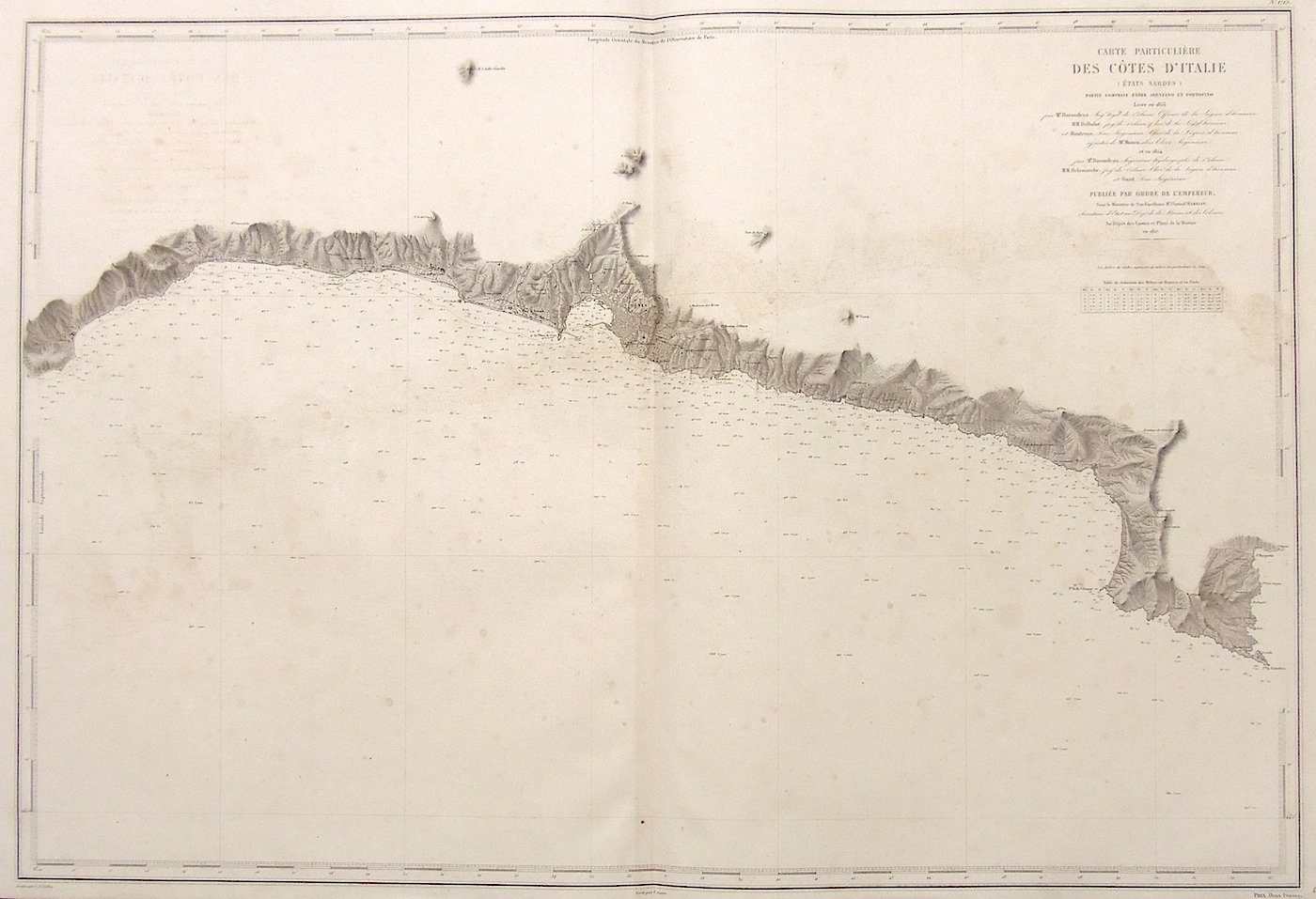 Incisione in acciaio di mm 660x995, incisa da Collin su rilevamenti di Darondeau, Delbalat, Boutroux e Manen. Carta nautica che offre un grande dettaglio delle coste tra Arenzano e Portofino. Rara e molto ben conservata, eccettuate alcune lievi fioriture e leggere tracce di sporco superficiale.
